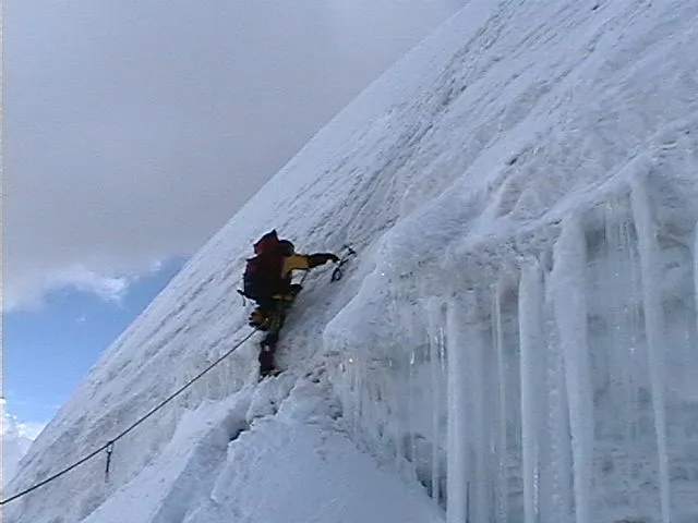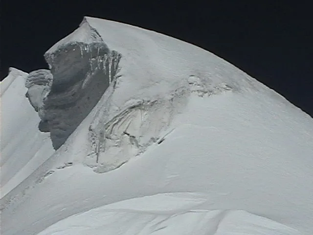 На вершине - огромный ледовый карниз, свисающий на пять метров в обе стороны.