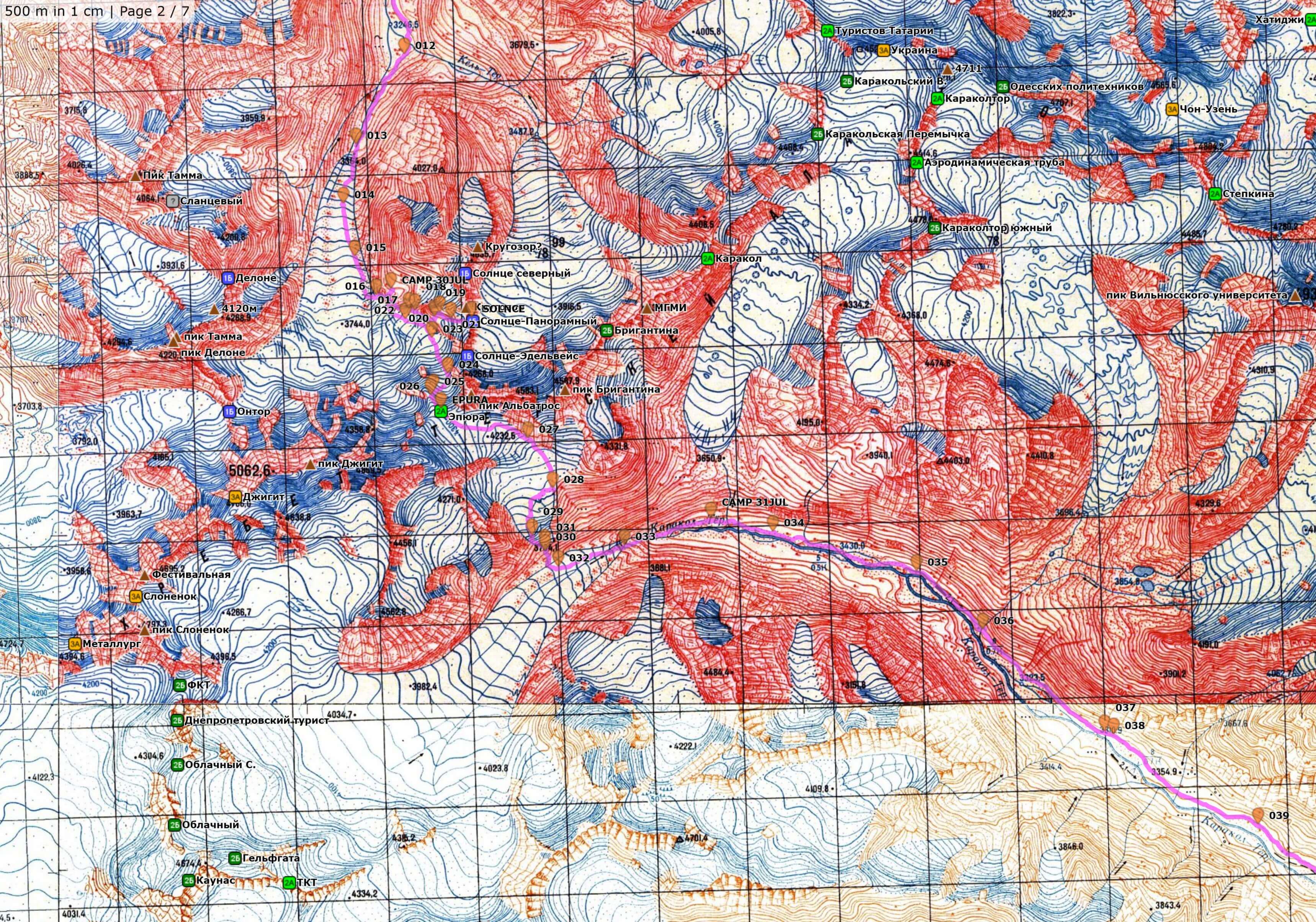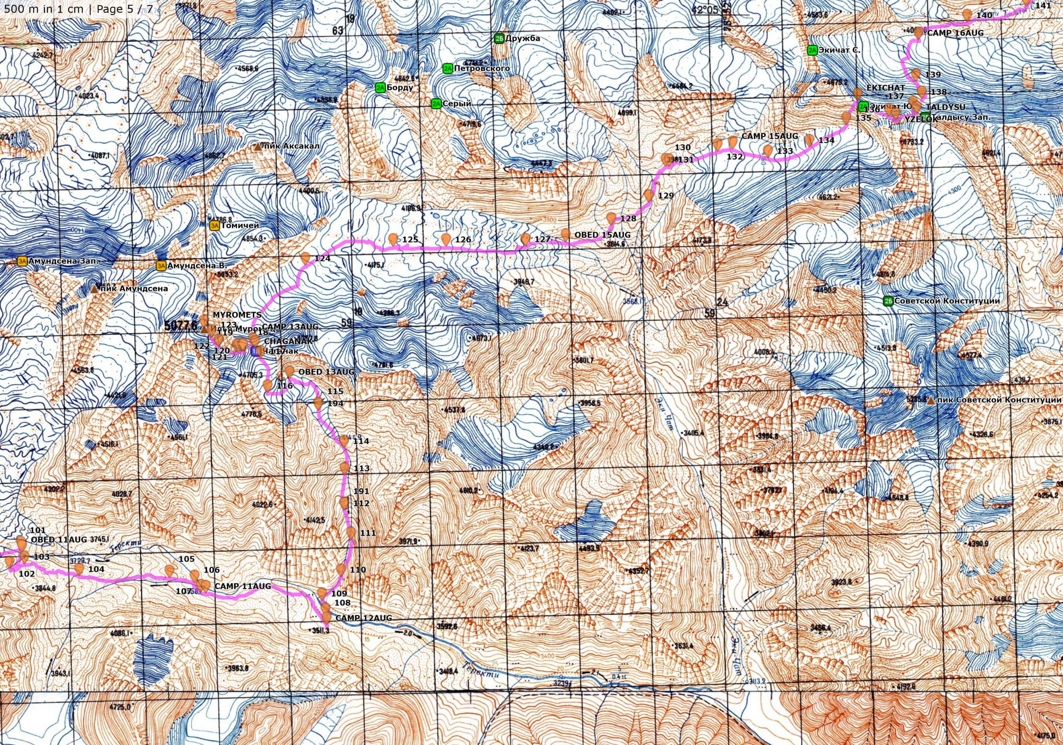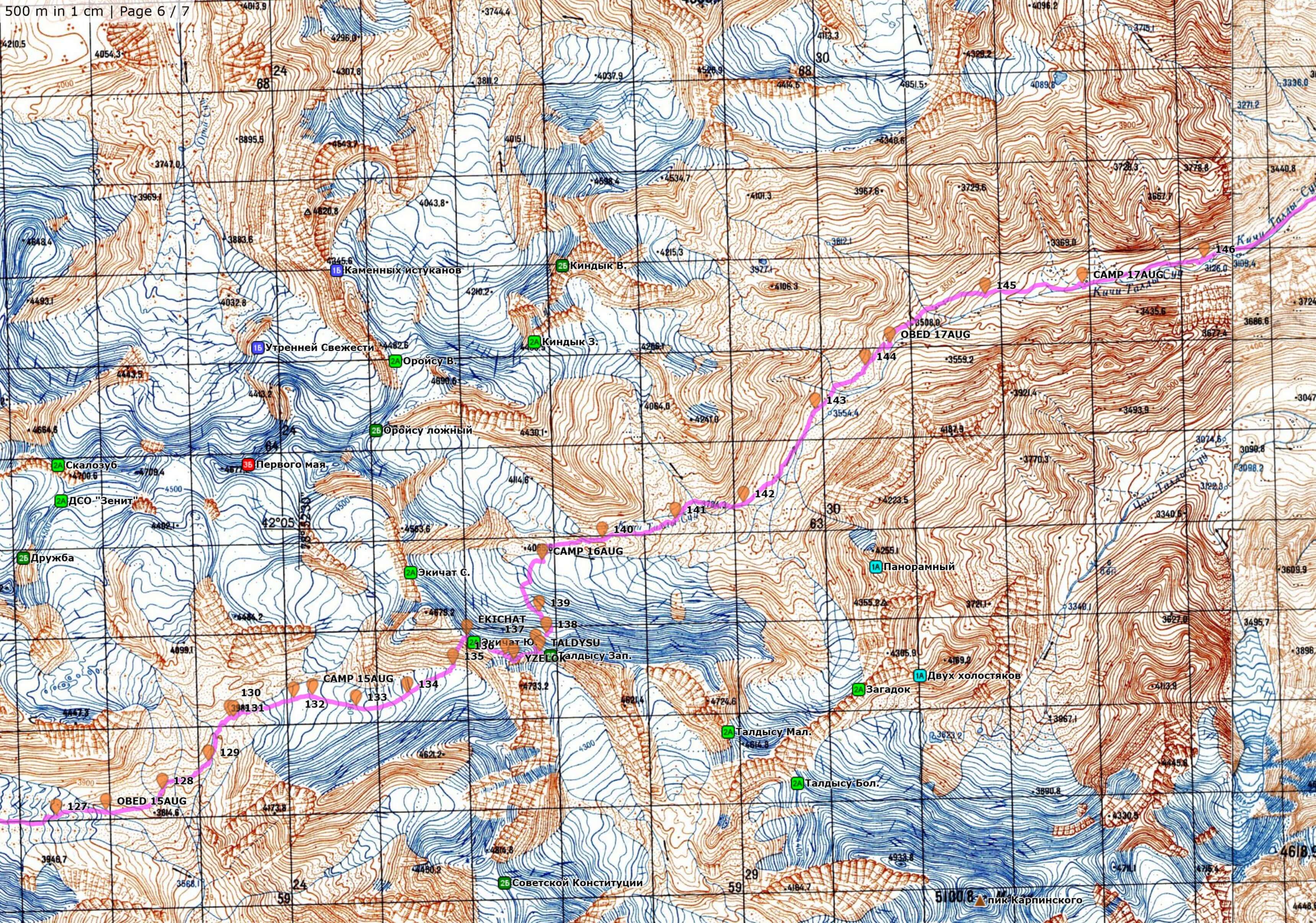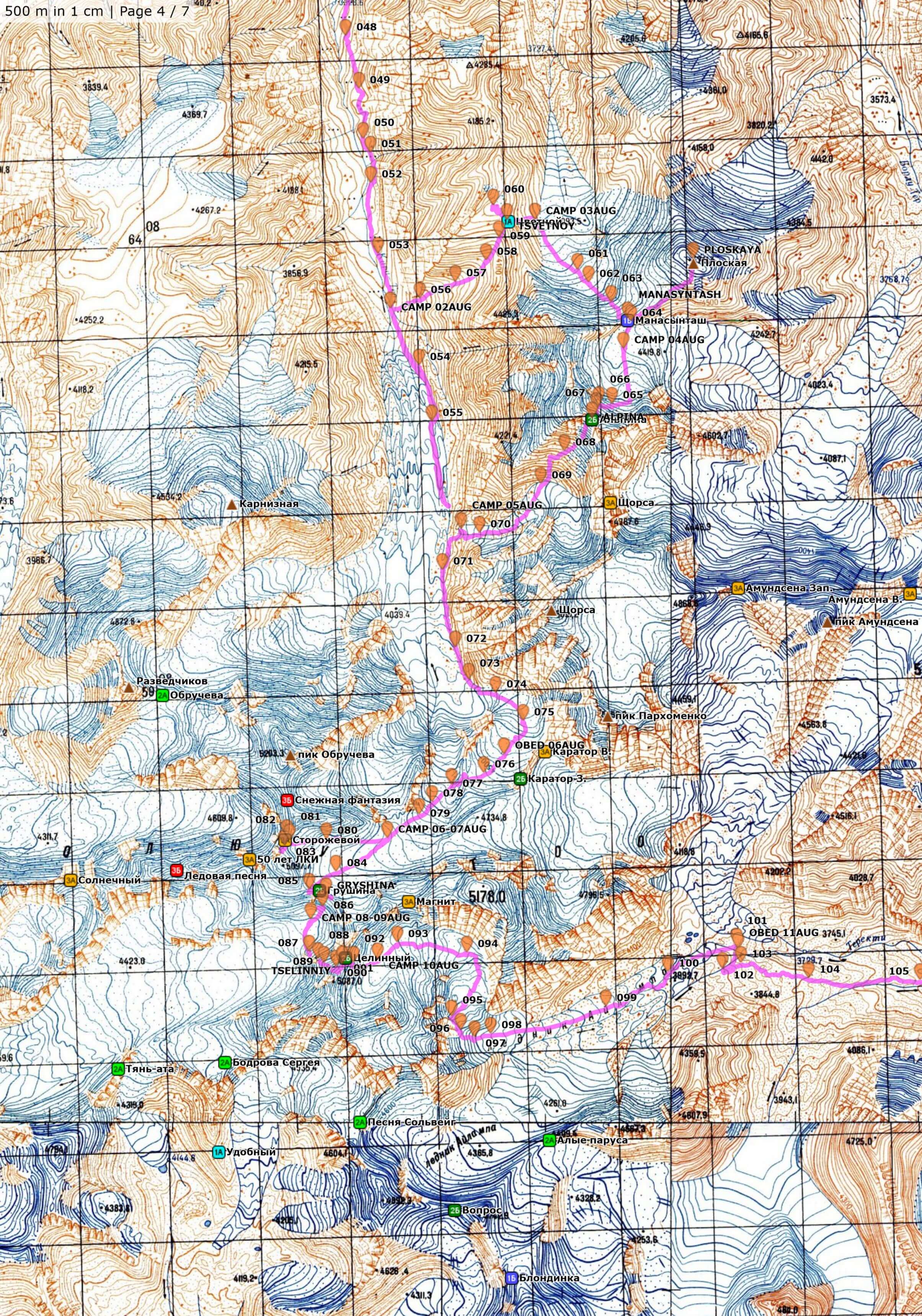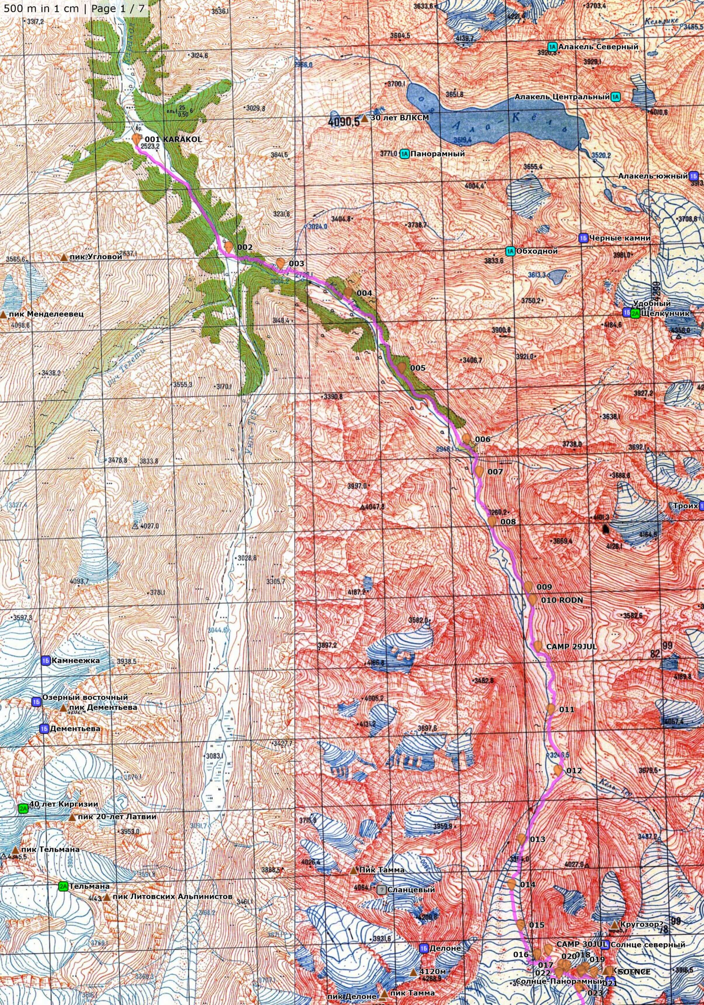 Нитка маршрута: а/л «Каракол» р. Кельтор лед. Джигит рад. пер. Солнце-Панорам ный (1Б, 4050) пер. Эпюра (2А, 4320) р. Караколтор р. Куйлю В. р. Каратор пер. Цветной (1А, 4230, п/п) пер. Манасынташ (4495) + рад. в. Плоская (1Б, 4740) Л. приток лед. Борду пер. Альпина (2Б, 4820) лед. Каратор рад. пер. Сторожевой (5010) пер. В. Грушина (2А, 4915) лед. Куйлю Ю. пер. Целинный (2Б+, 5050) лед. Айлампа р. Теректы пер. Чаганак (1Б, 4640) + рад. п. Илья Муромец (5078) (2Б, 5105) лед. Экичат Пр. лед. Экичат Лев. пер. Экичат Ю. + в. Узелок+ пер. Талдысу Зап. (2А, 4670) р. Кичи-Талдысу р. Сарыджаз