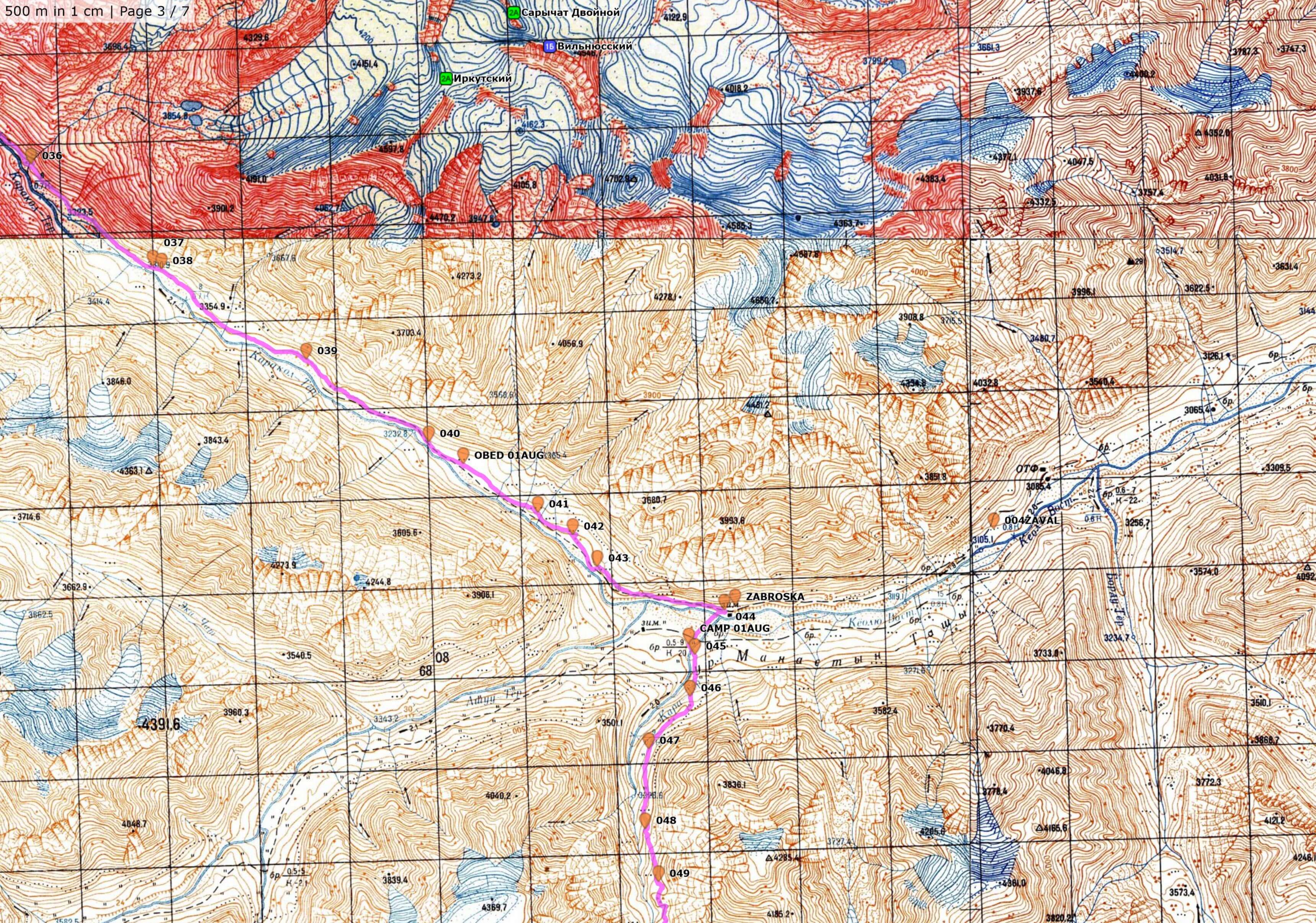 Подъем в дежурных в 4:30. Почти ясно, есть отдельные облака. Собрав изрядно потяжелевшие рюкза ки, выходим в 6:50. Сегодня нам нужно не спеша, не надрываясь подняться под ледник Каратор с грузом на 18 дней и, если получится, отнести заброску на ледник. Рюкзаки весят 26-27 кг у девушек и 37-40 кг у мужиков, поэтому темп движения в этот день сознательно невысокий. Рядом с местом ночевки переходим вброд Каратор ([045], утром воды мало, брод не представляет сложности) и в 7:15 начинаем подъем по лугам на наклонную террасу, которая находится на 100-150 м выше уровня реки. Проходим мимо стада яков. Местами встречаются участки тропы, но в основном идем по травянистым террасам, стараясь не набирать и не сбрасывать лишнего (фото 3.1). Через 1,5 км (1 час), после поворота ущелья, на террасе появляются каменные россыпи и колючая карагана. Без лишних сбро сов и наборов также не обходится. Кое-где попадаются туры и отрезки тропы. Впереди хорошо виден ледник и пик Каратор, затем открываются галечные поля перед языком ледника (фото 3.2). Наконец тра вянистая терраса заканчивается, внизу у воды видны небольшие конгломератные и скальные прижимы, со склона бежит ручеек (первый с начала подъема, [051], alt=3515). Траверсируем достаточно крутой мелкоосыпной склон 200-300 м, затем по мягкому конгломерату и мелкой осыпи спускаемся к воде ([052], alt=3505). Можно было выйти к реке несколько раньше, не траверсируя склон. Через 1 час ЧХВ подъема по камням вдоль реки и по террасам на небольшом отдалении от нее выхо дим к слабому ручейку, фильтрующемуся между камней (фото 3.3). Хороших мест для палаток рядом нет, но есть участки мелкой осыпи в сухом русле ручья, пригодные для установки палаток. В непогоду здесь стоять не хотелось бы. Ставим лагерь, обедаем (12:00, [CAMP 02AUG], alt=3620). Ручей, у которого мы встали, судя по всему, фильтруется откуда-то из кармана, из маленького ледничка или снежников, со мнительно, что он постоянен. Между нами и языком ледника есть еще 1-2 аналогичных ручейка, но так же нет хороших площадок. Долина проходима и по левому берегу. Сначала тропка траверсирует склон высоко над рекой, затем идет по травянистым и осыпным террасам. По нашему мнению, путь сопоставим по сложности с прой денным нами, может быть немного удобнее: кажется, что тропа мощнее. Кроме того, на правом берегу нет воды от низа и почти до спуска к реке, а на левом тропа пересекает несколько небольших притоков. Однако выход на ледник проще в орографически правой части языка, то есть при подъеме по левому бе регу придется переходить Каратор вброд в середине дня впрочем, похоже, это не большая проблема, т.к. поток разделяется на два. После обеда в 14:35 ввосьмером отправляется заносить заброску. От лагеря движемся траверсом не крутого конгломератно-осыпного склона в направлении окончания правого (орогр.) кармана ледника (фото 3.2). Выйдя в карман по конгломерату и морене крутизной до 35 ([054], alt=3760), поднимаемся по нему около 15 минут, пока уровень кармана не сравнивается с уровнем поверхности ледника. Дальше карман менее удобен для движения, чем ледник, который здесь открытый, пологий, незначительно вс холмленный (фото 3.4, 3.5). Выход на ледник прост, не требует кошек ([055], alt=3840). Налетает крат ковременный заряд непогоды (снег, дождь). За 20 минут поднимаемся по леднику к створу долины ледни ка №118, ведущей от перевалов Альпина (2Б) и Щорса (3А). Времени уже нема