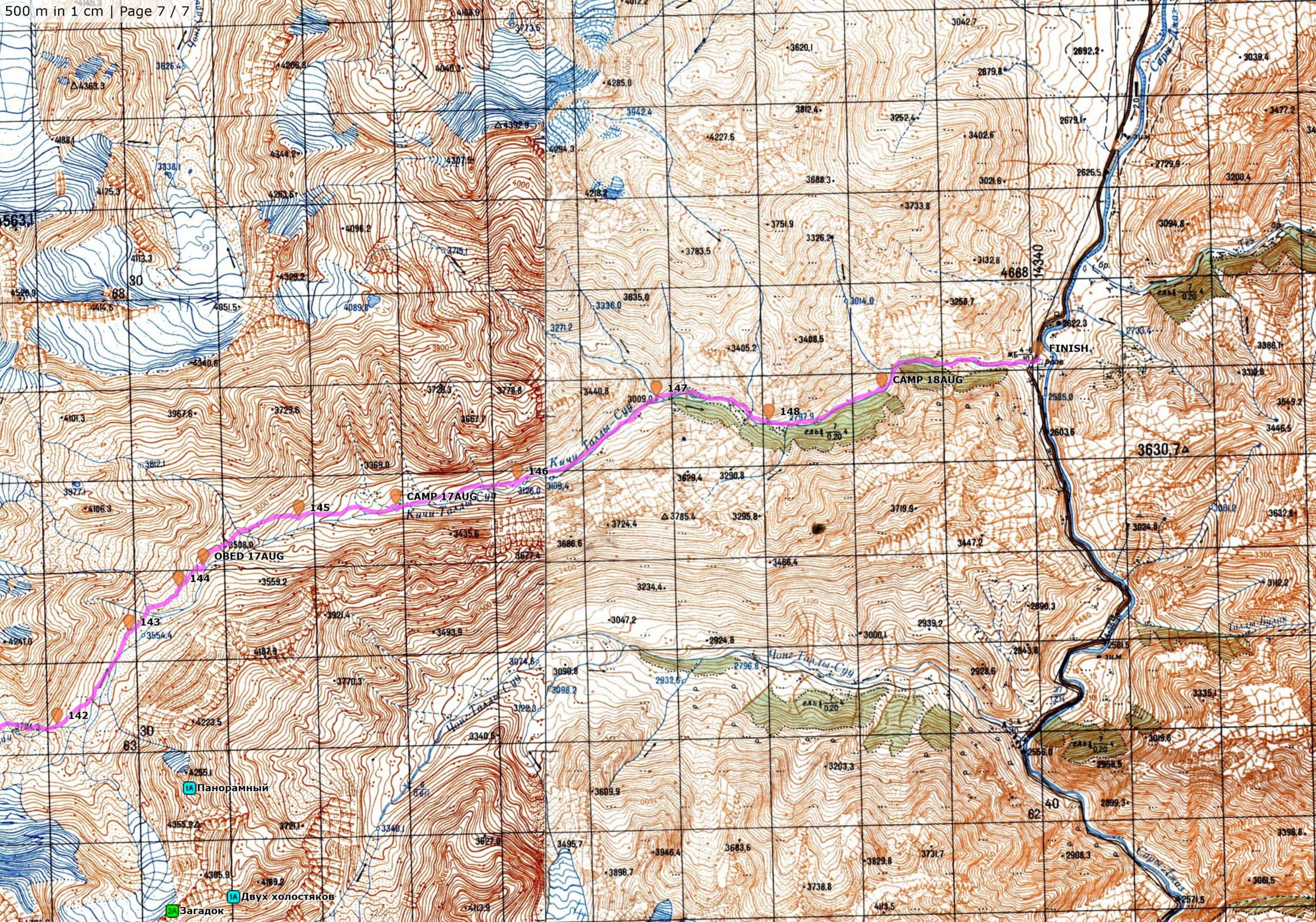 Подъем дежурных в 5:00, выход в 7:00. Ясно, не холодно. Через 5 минут после выхода переходим по камням поток с ледника Караколтор Восточный. Утром это несложно, разве что камни местами обледенели. Вечером брод может представлять трудность. Дальнейший спуск проходит по невысокой террасе, местами поросшей травой (фото 2.15). Встречаются места для ночевки и чистая вода, например [034]. За 45 минут ЧХВ от места ночевки спускаемся к началу лугов, здесь появляется слабая тропка ([035]). В 8:10 выходим к крупному притоку, несущему воду с ледников № 60 и 61. Река круто падает с устьевой ступени, русло завалено крупными камнями. Место брода хорошо читается, к нему подходит тропа ([036], alt=3375). На другом берегу видим группу, которая заканчивает переправу. Готовимся к броду, но один из участников находит выше место, где можно перепрыгнуть реку по камням. Переходим реку по камням с гимнастической страховкой за 1 час с разведкой и переодеванием (несколько больших шагов, частично залитые водой камни – безопаснее было бы пойти вброд, фото 2.16). После переправы продолжаем спуск по тропе до притока из цирка пер. Вильнюсский (1Б) (фото 2.17). Несмотря на то, что в верховьях этой долины находятся достаточно крупные ледники, вода в притоке прозрачная. Останавливаемся у реки на обед, т.к. по имеющейся информации дальше воды не будет (10:50, [OBED 10AUG], alt=3225). Здесь же расположилась на обед встреченная нами ранее группа – это «четвёрка» под руководством Д. Арефьева из Санкт-Петербурга (турклубы КТУ и ПКТ). Общаемся с ре бятами. Погода хорошая – солнечно, жарко. Купаемся, стираем одежду. В речной заводи ходит большая стая мальков форели. После обеда выходим в 14:30. Тропа продолжается по просторным лугам (фото 2.18). В точке [041] пересекаем ручей (хороших мест под палатки рядом нет). Погода постепенно портится: верха в облаках, поднимается ветер. Движемся по ровным лугам, впереди читается слияние Караколтора и Ашутора (фото 2.19). Через 20-30 минут нижняя терраса приводит к прижиму, поднимаемся по короткому крутому травянистому склону на холм (стоило начать забирать вверх раньше). Здесь еще один ручей с чистой во дой ([043], alt=3190) – последний, ниже в долинах Куйлю, Каратор у слияния чистой воды нет. По травя нистым увалам проходим высоко над слиянием рек, затем появляется тропа, которая плавно сбрасывает высоту к мосту через Куйлю (фото 2.20, 2.21, 2.22, 2.23). В 15:40 мы на дороге у больших камней рядом с мостом через Куйлю ([044], alt=3155). Пешеходный мост около больших камней в русле ниже впадения Каратора в Куйлю сейчас не существует. Откапываем заброску в камнях на склоне и, кое-как распихав по рюкзакам, переходим по мосту Куй лю и отходим от дороги в долину Каратора, где в 16:25 ставим лагерь ([CAMP 01AUG], alt=3160). Вет рено, начинается дождь. Вода только в Караторе, умеренно мутная. Распределяем заброску, вечером на носим визит вежливости в кош. Рядом с кошем стоит знакомая нам группа Д. Арефьева и еще одна петер бургская группа – «пятёрка» под руководством Н. Хохлова. Они начали маршрут в восточной части мас сива Куйлю, а завтра, как и мы, собираются в долину Каратор и дальше на пер. В. Грушина. Чабан в коше в принципе способен помочь с заброской груза на 1-2 лошадях по Каратору и, воз можно, другим ущельям. Правда, в этот раз конь куда-то делся и нужно было идти к «соседу сверху» за его конем, в общем, не стали связываться.