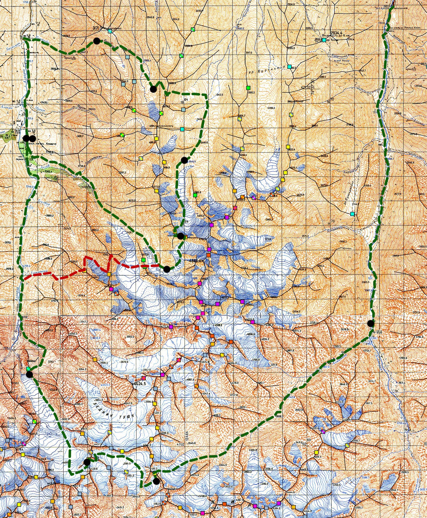 Рисунок 3: Схема прохождения связки перевалов Тайный, Ак-Дувал ложный и Героевантифашистов с лед. Голубина на лед. Геофака