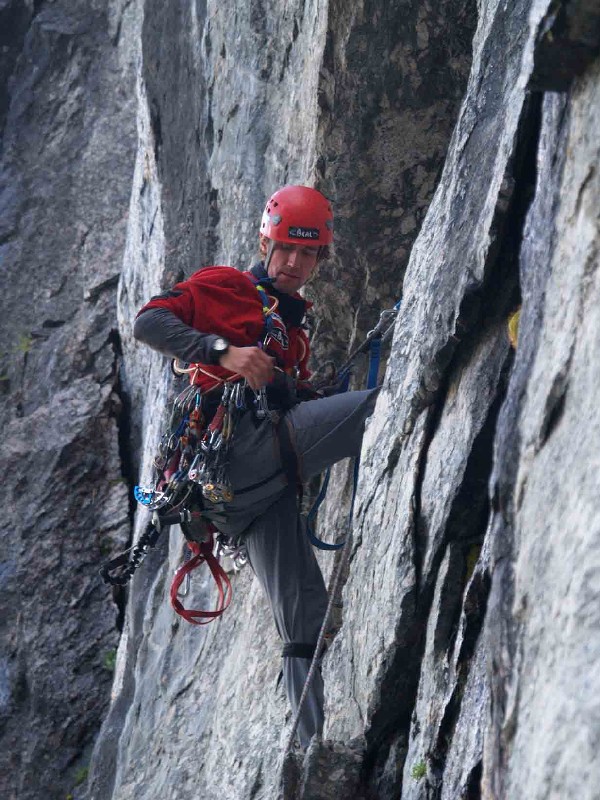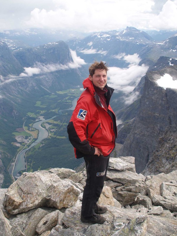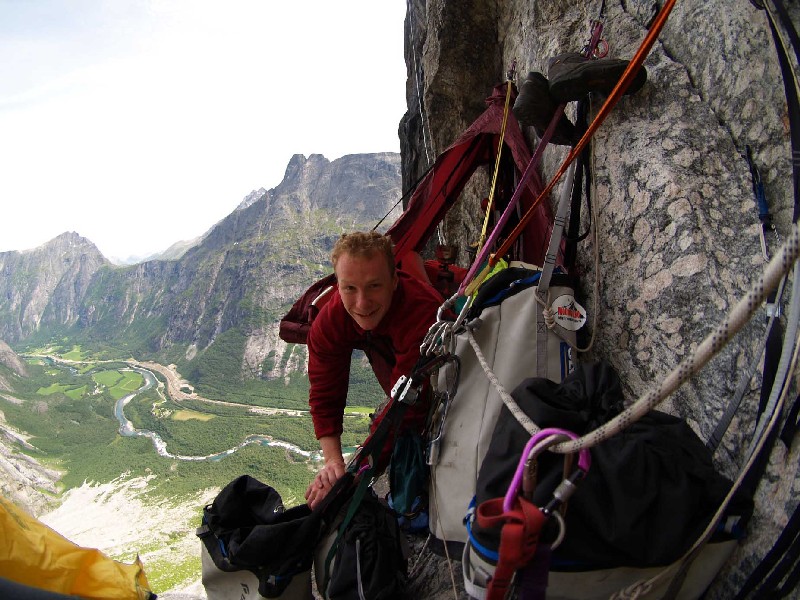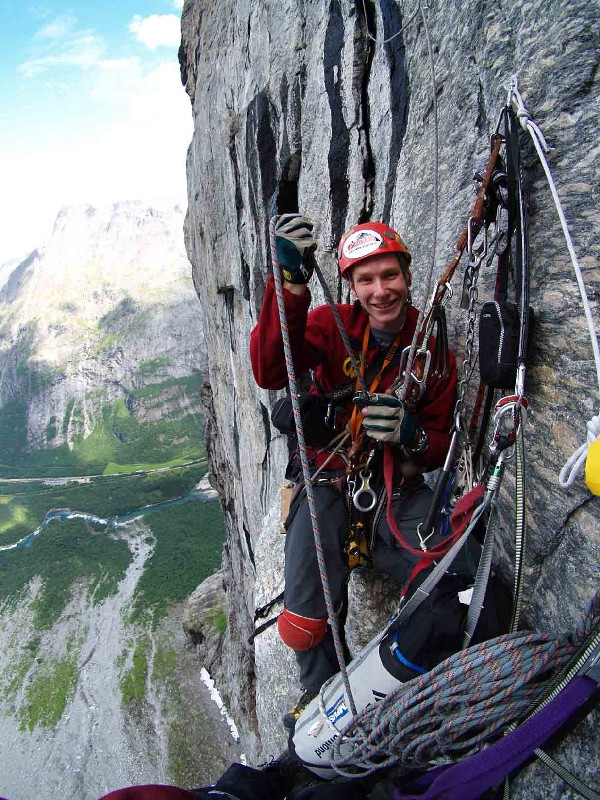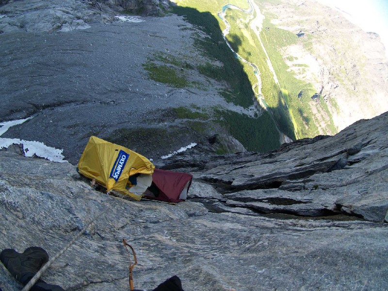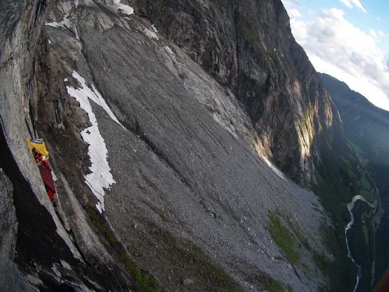 Up to the end of the day boys had climbed about 1,5 ropes even along the route, found many old bolts. In the evening David and Dave went to replace them. On the way they saw local alpinists. They were hanging literally like bunches in one slot on the rock near the freeway that picture was exactly like we could see on May holidays on Filatovskaya Troyka in Foros. Probably, it was something easy, we thought. Looked through the guide-book: 6c/6c+, climbing with own points. What could be said? – Fine fellows, nothing more! In the evening we came beside the wall, drank tea, share impressions and dispersed. Boys went downwards, to the camp, and we – in the tent, as the next day we should got up at 5 a.m. There were three of us, so we settled down in a two-place tent with difficulty and tried to fall asleep, but without any success. When it got dark, from the wall began to fall down basers. Firstly airplane drone was heard, then a kind of bang. And above the valley a hardly noticeable dark parachute was soaring. Later it appeared, that jumps from the Trolls were forbidden, but, inspite of it, about 200-250 people every year jumped here. After landing they quickly put their things to bags and run away, because the fine for this entertainment equaled about 5 000$ plus the parashute and other equipment was confiscated. Generally, it wasn’t a cheap kind of pleasure. And it was nesessary for basers to run quickly. So, in the morning we with greate difficulty got up at 6 a.m.. Thanks to basers! Got in touch with people in the camp, it had fallen to their lot too. One of the basers at 2 a.m. landed just near their tents. The weather ended, the valley started to got cover by mist. Nothing to do, we had no extra time, so had to work hard. All the day long the first was Dan going, and one of the ropes even by free climbing. We managed to hang four more ropes and then it started raining cats and dogs, it was felt even under the hanging. So, we decided to go downwards, all the more that we had hung everything we could – there were no more ropes. When we were going downwards along the wall, it nigh only washed us off. Everything that was outside of hermetic bags got wet to the last thread. We took our camp and run downwards. On the way home Dan decided to repeat the exploit and forced the river through ford. When he realised that couldn’t cope the stream and swam, he remembered that his player and phone were in the pockets. In the next few minutes the norwegian echo learned many new words…