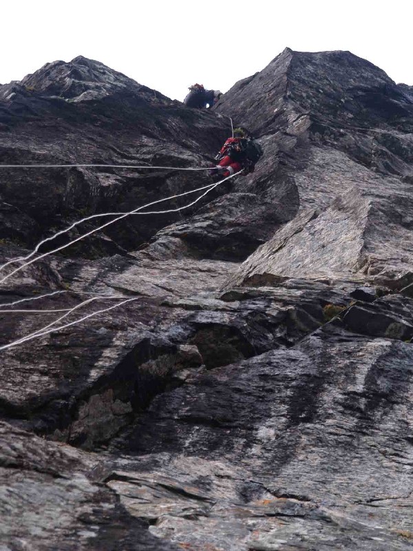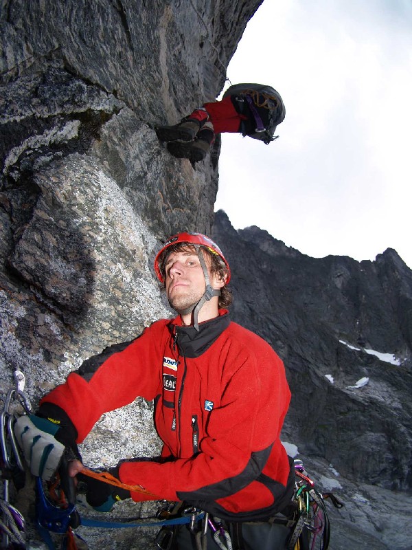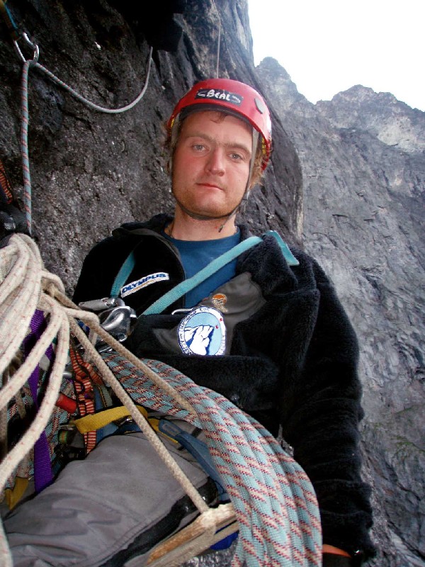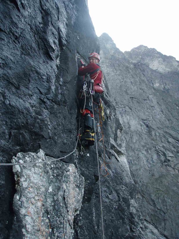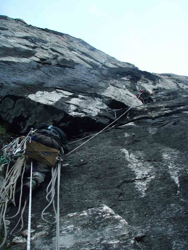 Only one thing made us feeling pleasure: the weather was fine. But, on the other side, if it were raining, we could get much water. Once in the evening we made a party, everything was how it should be: music, cognac, choral singing and even salute from gas ballons. It became more merry, but only for a short time.Two of the days we were watching British soloist Michle, who was going to climb up the swedish route. He several times tried to come to the beginning of the route but every time run down from falling stones. We hoped very much that he would give up his idea, but one morning saw his steamer trunk at the several ropes above the earth height, exactly in the couloir where stones were falling continiously all the time. That day in the evening a helicopter flew there and salvation works began. It is necessary to pay tribute to norwegians. They operated very clear, it seemed that in Russia we couldn’t do it like them. The helicopter made two circles taking photos, and on the 3rd circle they hang a man on the cable who hooked the lifeless body. We stopped all our activities and with the hearts sanked looked after the operation. The helicopter was hunging in the couloir, where every moment it could be broken by falling stones, textually 10 minutes later a gigant plate fell there . When the helicopter was passing us we could distinctly saw Michle’s body, hitched directly to the system, they hadn’t even pulled it in. What could we think? – Surely, a corse. Our misgivings comfirmed when the helicopter instead of going to a hospital landed in the valley. We tried not to speak about it. That evening everyone of us especially wanted downwards and home. And again came new day, again carrying steamer trunks. Dan was working as the number one. By the walkie-talkie all the time they asked for the rope, they so something like a positive piece! By the midday we climbed to grassy shelfs, forward was seen nothing, banisters were going in mist, sometimes small stones were flying down from there, but all this didn’t metion, there was green grass underour foots, bees were flying we could stay not in stirrups, but on plane – what a pretty feelling! But pleased we were for a short time. As soon as it became positive slooping it became unreal to carry steamer trunks alone. The only variant was like this: two of us on the palispaste and one – attendant, and this way - 3 moves per rope. It was wished something to get unfastened and fall down. Moreover, the mist dispersed and a new wall, approximately like 1,5 Morcheky stood up in front of us, and something said that we didn’t see it up to the end… Eh, we were here for a very short time again. On the one shelf we found some snow, so we drank tea as much as we want and renewed our ballast for about 50 litres. How we didn’t want to leave that place! Water – here it was, food – here, a nice sleeping place – there, on the grass. What we needed more! But Dan commanded to go away and went up himself, we gathered things. After 50 metres we saw one more shelf and a theatre stage, Saveliev was going there back and forward almost without belay and mumbling. We could hear only scraps of frases like: “It could be climbed up here… and here too… No, it’s illogical… No, here they couldn’t go exactly…” “ - Is it the end? Grisha, write to Pionova, let her give us Odincov’s phone number, may be he can prompt us where they climbed here.” The pendulum we, however, didn’t find, but noticed some triangular cornice, that was likely to be marked in the description, when we reached it, it became clear that we were going the norwegian route. The rock was friedle, climbing – difficult, bags were clinging to all salients, generally… everything was excellent… In the evening we again declared communism for food and poured out 50 litres of water that were carried there with such difficulty. When, according to our reckonings, we were in few days away from the top, Dan and David broke their platform. On approaching to the next spending the night we accidently woke up the Trolls. Thuder and lightnings! It hit at the neighbouring tops of our mount. It appeared that Rangarek (Armageddon in local idiom) had come. A suggestion to miscarry all the iron far away was voiced. A good idea, but somewhere downwards there was Daveid, the last words we heared from him by the waklie-talkie were: “Switch off walkie-talkies, quickly…, or now...”, and that was all, the end of the connection. We tried to carry steamer trunk by palispaste, but the rope didn’t go, the bags were likely to be sticked. What could we do? May be Dave hadn’t unfastened them from the station, let’s give him the rope. So, we give him firstly small piece by small piece and then several metres in a moment. Then through the noise of the rain we heard a hair-raising wail. Then rope was twitched several times. We decided to pull. 30 minutes later the bags and a man with the twisted face appeared. The first thought: let’s run away, this fellow wasn’t in a good mood, but we had nothing to do. The first 5 minutes after the meeting we could understand nothing but swearing. Then it was cleared up that we were a little bit guilty. It happened this way: Dave was sitting at the station when the thumderstorm began. The steamer trunks were not raised for a long time, so he decided to carry a part of them by banisters and then went down to take the second part. He had already climbed about a half of the rope when saw that we started to pull steamer trunks and stretched the station. He went down like a bullet and began to try to unfastened the station, and suddenly… Pour Dave, he catched himself 100 kg of bags. That was why he was a little bit angry. But it was normal… The thumberstorm had sharply stopped and we began to settle down on the shelf, as there was nothing and nowhere to hang. In the next day morning Dan heroically decided to reach the top by all means. We ate nearly al