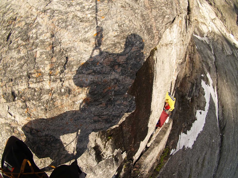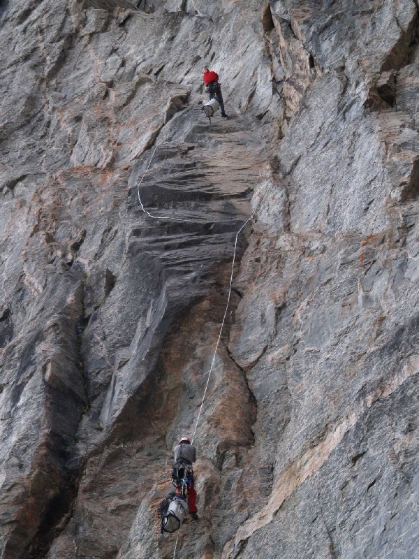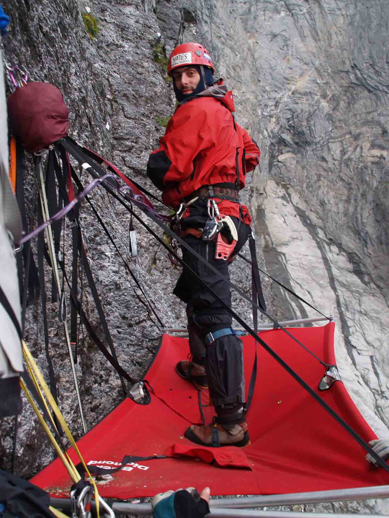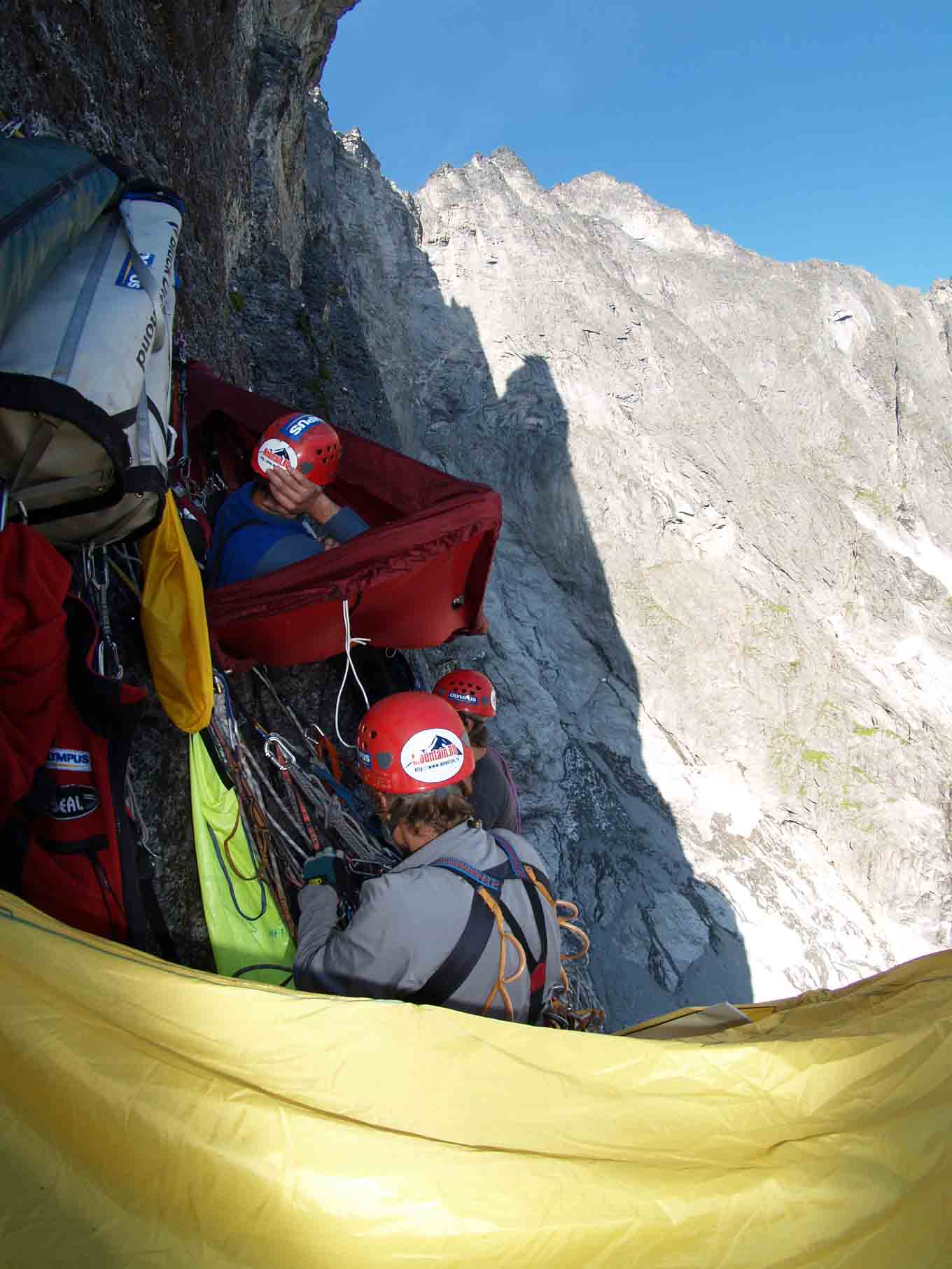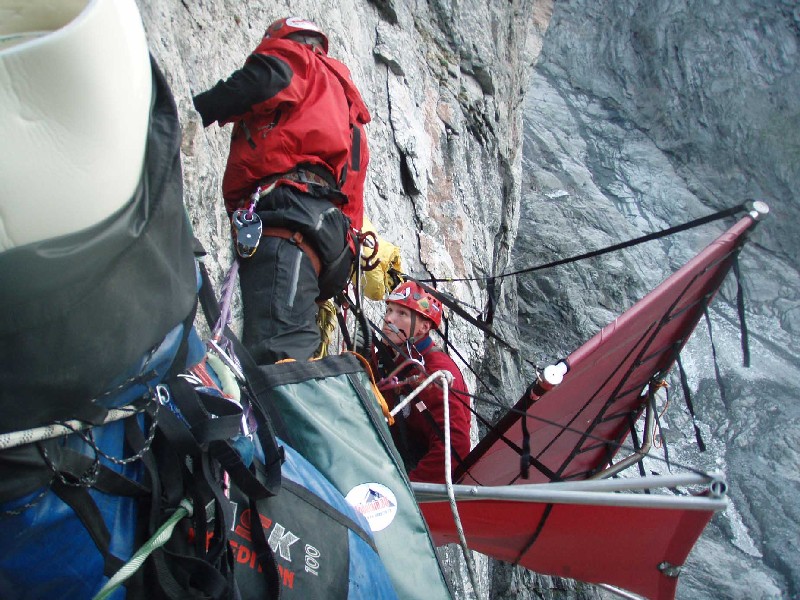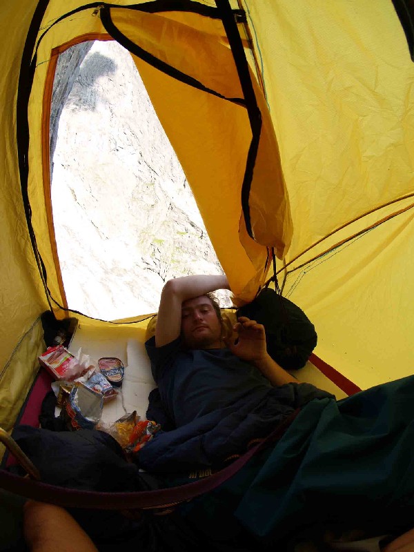 Night passed strangely calmly, didn’t know how other, but as for me, I felt asleep immediately and woke up only closer to the morning. Represent, you open your eyes, above is yellow tent, all is like you are lieing in the tent somewhere in the camp or even in the forest near Moscow, and suddenly you hear strange sound like muted airplane drone. I automaticaly opened the tent to understand what was happening and suddenly felt giddy: we were hunging at about 200 metres above the earth! Near were flying basers. Everything became clear. O, shit! We had yesterday climbed to the wall! And now would’t climb down for a long time… this thought made me feel uncomfortable. In the morning the next surprise was waiting for us, the withdrawable bolt, on which one of the platforms + 3 bodies + 4 steamer trunks + big heap of different things were hanging, was taken out from the wall by the light handmoving. This news put all of us to a kind of shock, we made revision and recognised that there were only few fine bolts, other had too cut tsangs, and they didn’t open inside of the wall. Generally speaking, it was a trouble and even Saveliev, the supporter of pure style, lamented that for the kilometre-long wall five bolts were not enough. Apropos, it was he, who had spoiled our bolts with the help of the saw, could he do it deliberately? It was normal…