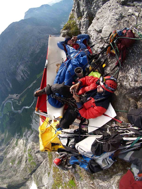The whole day was spent on solving organisation questions. In the evening we came to agreement that we should go to the wall early in the morning in order to avoid rain that started there stricktly at 4 o’clock p.m.. However, closer to the end of the night it was realized that only the half of the group had put the clocks to the Norwegian time. Alarm-clocks were ringing from 6 till 8 o’clock a.m.. As a result nobody sleeped himself out and the departure was postponed to 11 a.m.. Thus, we prepared things to delive and started the way: 3 km by freeway up to the railway brigde.Across the bridge – by short defections, because trains there were rasing at the speed of about 140 km/hour. Then 1,5 hours by coast and moose paths up to the big stonesteam near the foot of the wall. Then 3 more hours upwards. As soon as we started to pass the disposite of large stones, different finds that couldn’t but perturb an alpinist’s heart: scarps of broken ropes and loops. But some useful things, for example a pair of carabines of well-known american firm, were also found there. While we were creeping over the stones, it started raining, so when we reached the wall, we had already been considerably drenched. Then we had to find a route. Firstly it had been desided to climb the route “Baltica”, but where the beginning of it was, we wonder… The description was rather skimpy, we had only the UIAA scheme. Cornices, slots – there were a lot of such things. So, we began to stroll along the wall in hope to find marks that could mean the beginning of the route. Suddenly Grisha shouted joyfully: “I found!” – and waved something like a wrapper. Appeared that it was the packing of vitamins made in Russia in 97. Oh, here were russians! We looked attentively – truthly, the slot, something like a loop hung. Probably, there. So, we rejoiced and run back home. On the way we came across someone’s fresh traces. David declaimbed that they belonged to a wild boar and we should be more careful, but nobody took care about his words. Later we realised that a wild boar turned out to be a little baby-deer, that David himself nearly trampled down. As we came to camping we felt something wrong. Different people came to us and asked various questions. Later we understood that the master of camping had told everybody that we were going to climb the wall. So, whole families came to stare at us, and it was Dave, who became the most popular person, he showed our platform and explained everybody in details how to live in it. In the evening one Finnish alpinist visited us and said, that we are fine fellows, “Cool idea!”. Dave Saveliev showed him the newest invention, ancor hooks, and tried to sell a pair of them, but the finn said that “aid climbing” didn’t taxi, and moreover, he had to climb 10 ropes 7a on the route the next day, and went away.The last trait to our popularity added an episode at the kitchen. Two swedes gave up us the stove, saying that we need to eat a lot. They even wanted to give us a pan, but then, when they found out that we were going to cook “pilaf with pork”, quickly reconsidered.