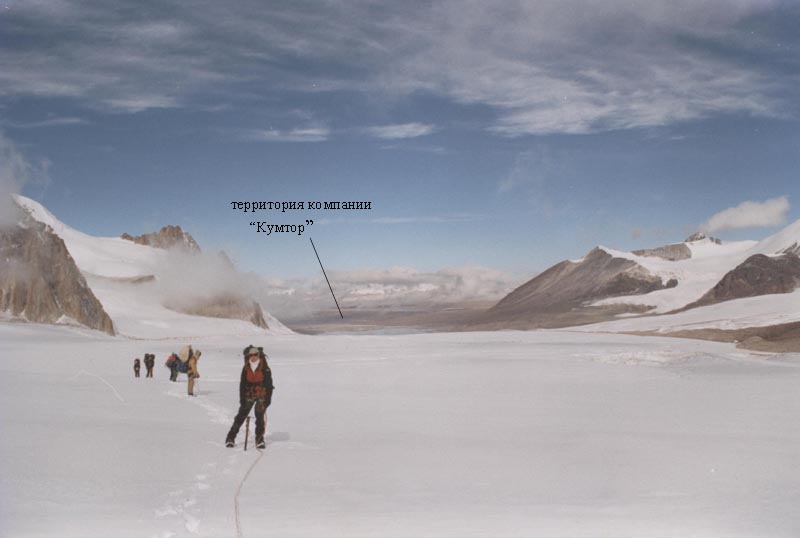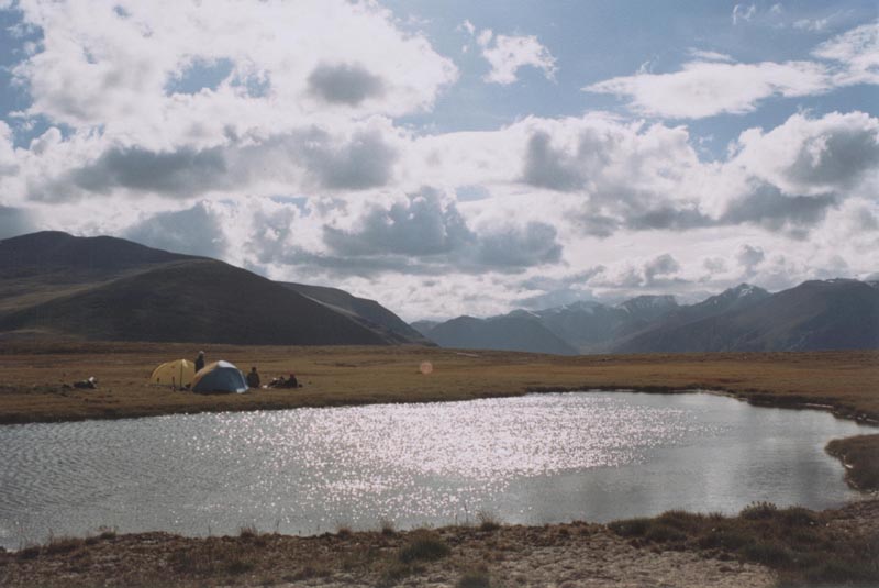 To hiding place on Sari-tor river 17.08. In the morning it is gray and rainy. We are at 3600 meters above sea level here, but the mountains are out of sight, the whole of Ak-Shijrak ridge is covered by thick hat of clouds. At 7 we leave our campsite at the lake for the river Sari-tor, where we want to leave some food and stuff to use on the way back. To avoid the private lands of a local company Kumtor we walk along its border for 1,5 kilometers and then take the north direction somewhat left from mountain with altitude 3803 m . Gradually we change the direction to east and walk to the right of some lakes, shown on the map. The grounds here are wet, but walking is still easy. In two hours we make it to the river that comes down from Dzukuchak pass. Having taken our boots off, we quickly cross the stream, the water touches our knees. Then walk east, along Sarichat river, but not directly near it. At 13 hours noontime we put our food supplies packed in sugar-sacks into a niche and bury with stones. At 17.30 we are at our camp in time for supper. It is now when we begin to feel the height. 18.08. We start at 7.50, walk to river Kumtor and along a dirt-road to the wooden bridge over the river. Following the road we make our way towards the easy Akbel' pass that divides the massifs of Ak-Shijrak and Sujek. Leaving the South Bordu river we walk to the slopes of mountain with altitude 4492 m . By this time the group seems tired because of the height and we bivouac at a small lake.