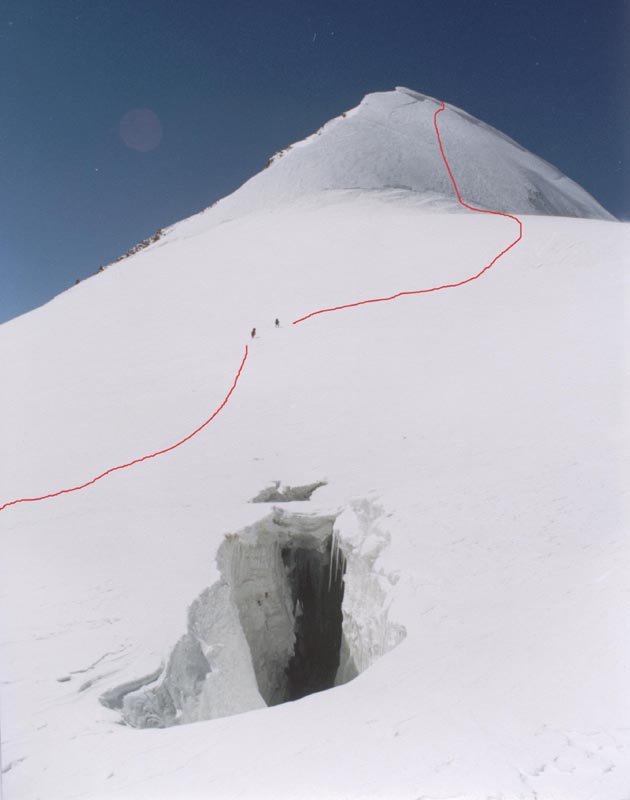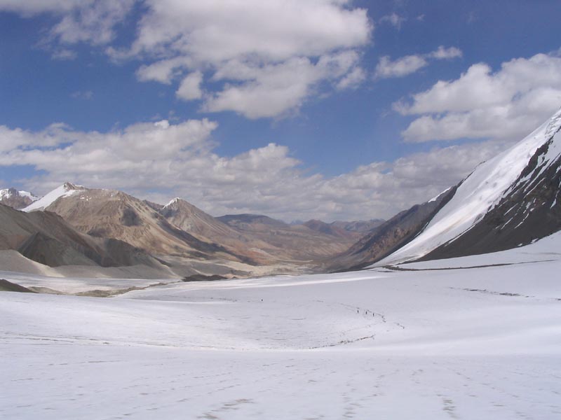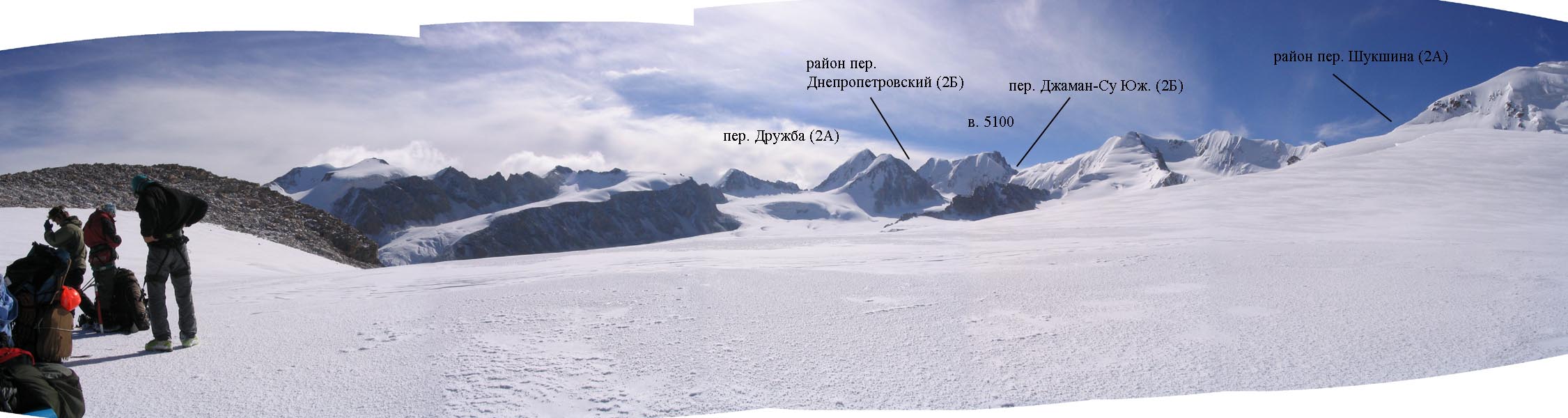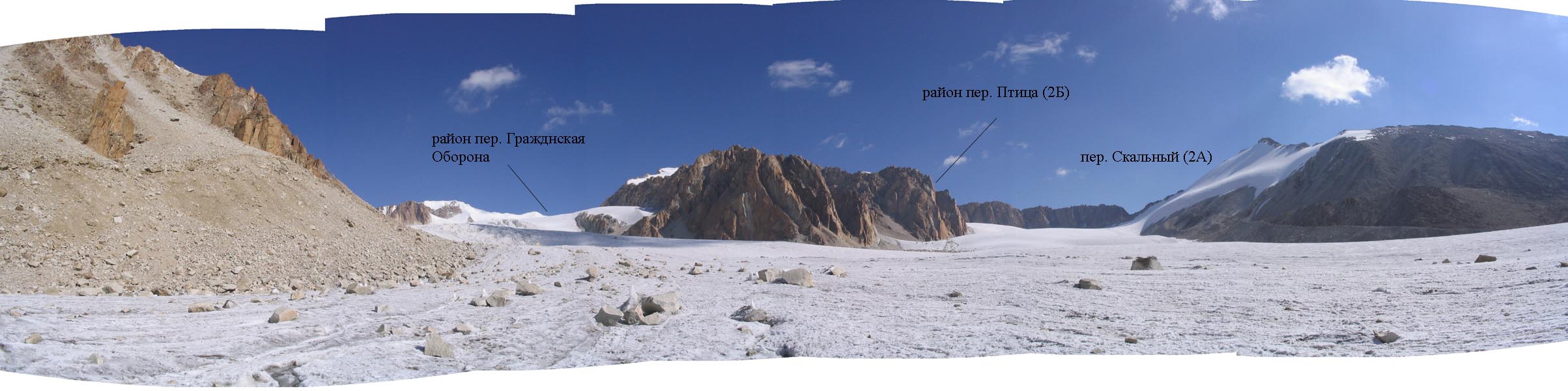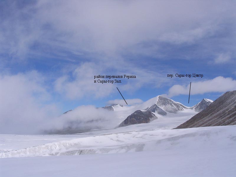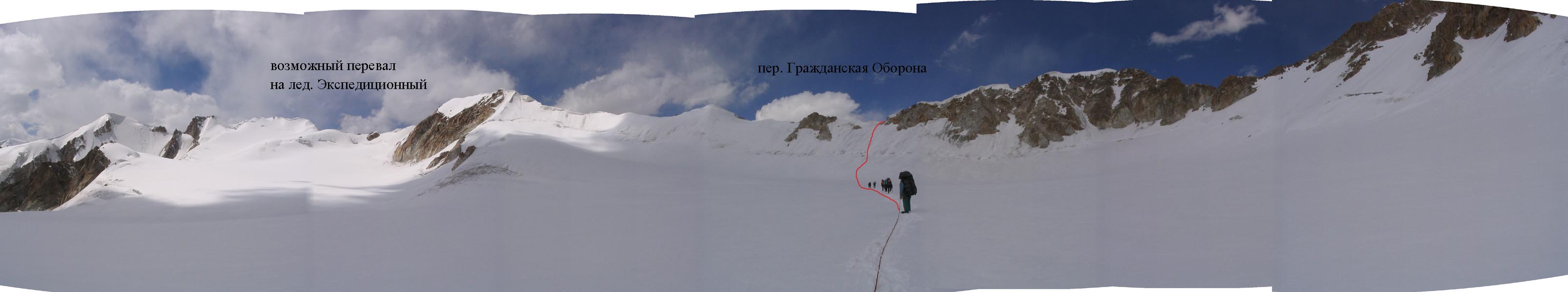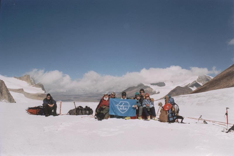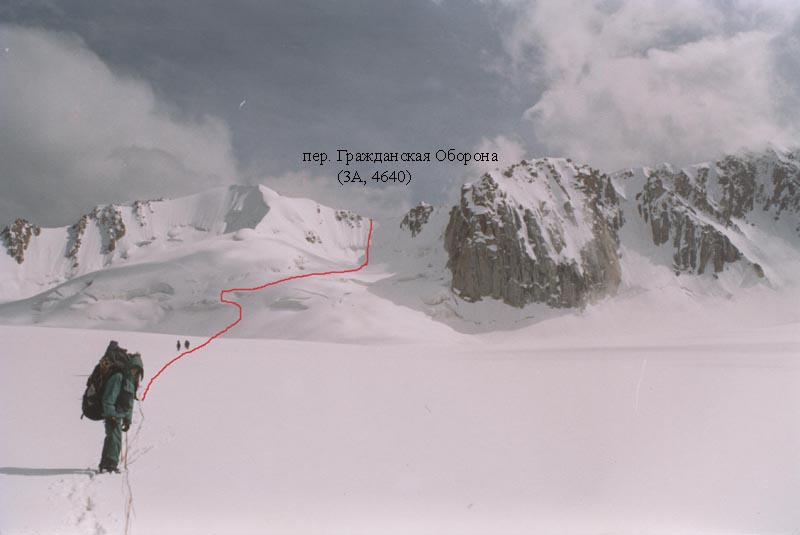 19.08. On our feet at 6.10, without breakfast we go off through the valley to the pass. After walking up to Kazan glacier we get the ropes out for safety, as the glacier is covered and there might be cracks on our way. The average incline of the glacier is 15-20 degree, on the whole it is quite flat and not torn apart. By the time we see our pass the weather grows worse, soon it becomes very windy and clouded. We quickly dig into snow and put up the tents. By now it is even snowing. 20.08. In the morning the sky is clear. A mountainside of about 20 degree is leading to our pass. At 7.30 we start off tied by ropes. There is a crack below the pass, but it is easy to cross and the way further is quite easy. The pass itself is wide, there is even some place for tents. We make a small tower of stones at the cliffs on the right, from here it is good to make a try for the unclimbed peaks to the north and south. A snow-slope of about 30 degree is leading downwards, gradually it flattens out at a large glacier, that is a tributary of North Kara-Sai glacier. In the central part there are a few cracks, we avoid them taking right. The snow is quite deep and it sticks on to our crampons, but still we walk easily and fast, in one hour time from the pass we make it to the moraine and rest here. Then we descend the moraine. The lower part of North Kara-Sai glacier has melted. Now here are many lakes of different size. We walk along the right side of Karasai river valley ant then to its source, in the eastern part of the valley. The river Karasai is quite deep here, but the current is not strong. We wade it in pairs of two. Another 30 minutes and at 17.40 we bivouac for the night at a picturesque lake. Kaindi pass (1B, 4300 m .) The Kaindi pass is a glacier that connects valleys of Karasai and Kaindi rivers, technically easy but ropes could be needed. 21.08. We start at 7.20, the sky is clear. The way to Kaindi pass leads through right-side grassy terraces of river Karasai South with a gentle ascent, the terraces gradually change to stony moraine of the glacier. We did not go to Kara-Sai South glacier at its tongue, but moved further to the inflow of a huge right tributary. This right tributary is over 1 kilometer wide, the glacier is open and practically flat. We walk over to ice and cross to the main glacier. At 11.30 we are at the pass, total walking time from bivouac made 3,5 hours. The weather is growing worse. The descent from the pass is over the Kaindi glacier. The glacier itself is snow-covered, cracks are present, so we tie up with a rope. We descend further to the joint of glacier valleys Kaindi, Veeroobrazniy and Ekspedizionniy, it is filled with conglomerate. At 15.00 we stop for dinner, it is interrupted by sudden snow. A peak between glaciers Ekspedizionniy and Veeroobrazniy is a good guiding line for us. The way is quite hard and steep. About 1.5 kilometers from Kaindi glacier we find a clear lake and good place for bivouac. The weather favors us and sends excellent views and sunset. Grazdanskaya Oborona pass (3A, 4640, first ascent) The snow and ice pass Grazdanskaya Oborona is situated in the central part of Ak-Shijrak ridge, it connects the west branch of Veeroobrazniy glacier and south-east part of Petrov glacier. In the off-season there could be an avalanche danger. Planning our route we had fotos of the north side that determines the difficulty grade. From the south we chose the easiest col. 22.08. Bright morning as we take off at 7.30. In 30 minutes time we are at the river that flows out of Ekspedizionniy glacier. We cross the stream and walk to the glacier in its western part, where it is not so steep. On the glacier we move in the central flat part, soon there are some cracks, some are small enough to jump over, others have snow-bridges. By now we are tied with a rope and have our crampons on. The first step of the glacier is gently sloping, the second step is steeper. We avoid the ice-break in the central part taking right to the ice slope of about 25-30 degree.