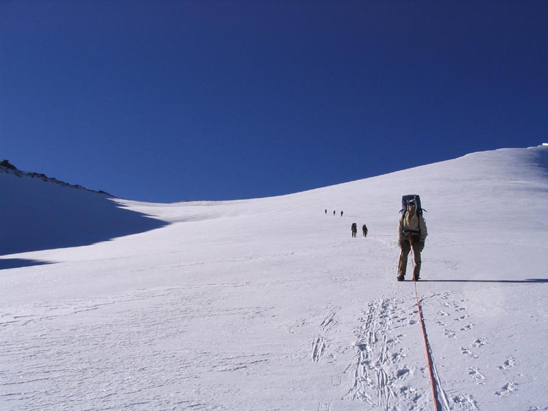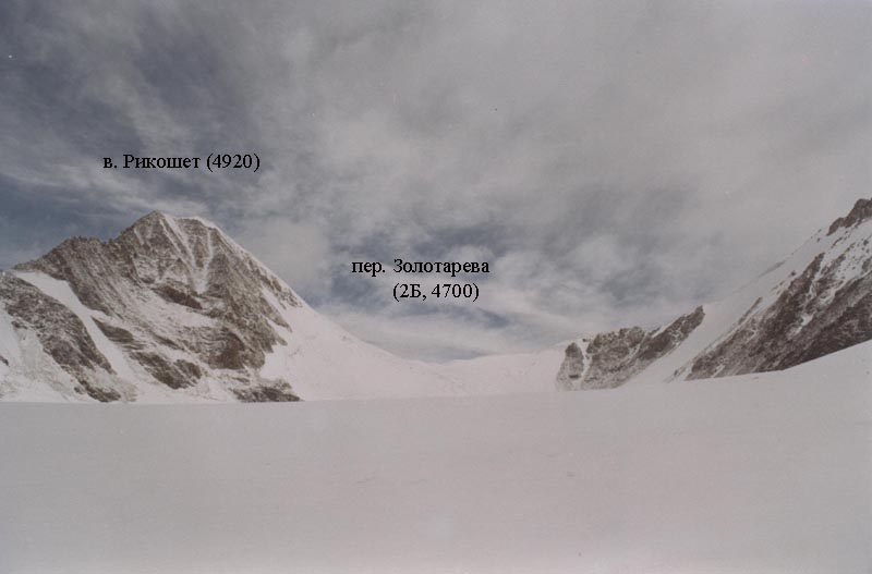 At the second step we gather and walk secured with ropes. The right part is less torn by cracks, but even here we have to use snow-bridges and be very cautious. When the cracks-zone is behind the easy snow slope allows us to slide to Petrova glacier. The way from the pass to the glacier took us 4 hours. The south-east part of Petrova glacier is quite flat, there are no great cracks. Soon a cloud wraps us up, we find our way forward along the side cliffs. The ice axes in our hands begin to buzz and polar clothes electrify. Quickly we stop for the night and carry all metal things away from the tents. It is 17.00, and another 1,5 kilometers to the ascent-point to Petrova pass. Petrova pass (1B, 4370 m .) Petrova pass is cover by a glacier and it connects two largest and most beautiful glaciers of Ak-Shijrak. It is the easiest way from the western to the eastern part of the massif. The Petrova pass lies between Petrova and Jaman-su glaciers, to the north from peak 4690.