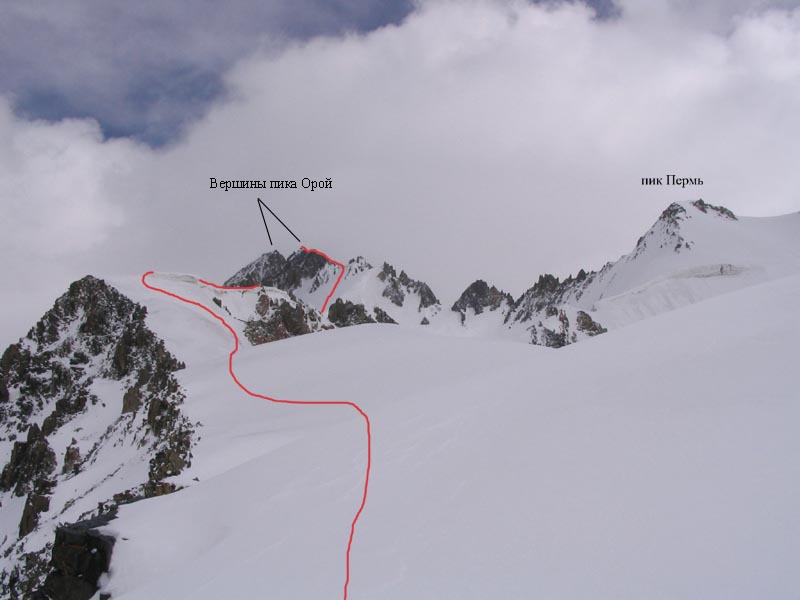 Peak Oroi South (2B, 5020 m .) We planned to reach the main peak of Oroi , but bad weather and visibility made us go back after reaching the south summit. 27.08. Grey in the morning, in the last 1.5 days we had about 70 centimeters of snow. Still we decided to go for the mountain, since visibility was acceptable and it was our last chance to go up. We secure with a rope and walk on to Solnechniy glacier. Fresh snow hides cracks, our first man stumbles a few times into emptiness with his foot. We head on to Zolotareva pass, there is a large open crack under the pass, we cross it using a snow-bridge. It takes us 1 hour 40 minutes to get to the pass from our bivouac.