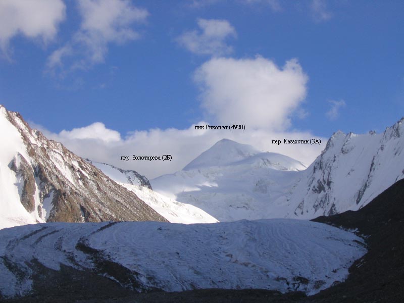 A snow and ice ridge with some rocks takes us higher, to a large saddle, so we have to abseil 50 meters to its bottom first and then continue up the ridge. We leave the rope hanging, in hope to use it on the way back. It took us 2,5 hours to get here from Zolotareva pass. There is much more snow here – up to our knees. Further it is no easier, since the ridge has some snow-cornices. Still secured with ropes along a rocky and unstable ridge we get to the south summit. It is snowing, thundering, the main summit is barely seen. We quickly decide to descend to our camp. One hour later we are at the rope we left behind, it took us a while to find it. As we approach the Zolotareva pass we have to stop and wait until the storm goes away, because our metal equipment begins to buzz and sparkle. Some time later the wind calms down and the thunderstorm moves away, with little visibility we continue our descent and soon return to Zolotareva pass. Another hour – and we are back in our camp at the moraine of Solnechniy glacier. First ascent to Rikoshet summit (2A, 4920 m .) from Zolotareva pass (2B, 4700 m .) The snow and ice Zolotareva pass connects glaciers Solnechniy and Oroi. We tried to ascend the north-east face of Rikoshet summit, above the Zolotareva pass. 28.08. Great weather in the morning, it is bright and sunny. We start at 8.45, at 10.00 we are at Zolotareva pass. We had in plan to traverse the 4920 summit, but now, after two day of snowfall the route seems very unsafe. The best we