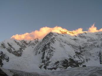 We started going upwards. That time it became very difficult for me to go, the rucksack had become heavy-weight. Having made a lot of breaks we went up. Then mist came, sometimes it rained. I had to hurry HaSe up in order not to become lost in the mist. We reached snow, then made climb up and the last traverse to the place for passing the night. There we built the Base tent ad quickly crept in it. It became snowing and raining cats and dogs, the time was 18 o'clock. We got warm, easy began to cook supper. Then we went sleeping, it continued snowing.