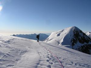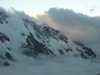 The 18 th of July. At three o'clock in the night we got up, put on the boots and started cooking. At 6.15 a .m. we set off from the bivouac. We pass three memorial tables (it was impossible to understand, whom they a dedicated from a distance). We climbed to the shoulder of Gestola, had a rest, took photos). Then we went on passing the route, HaSe started going as a leader. Snow became worse: sometimes it was firn, sometimes – crumbly snow. We went rounding a little bit as they recommended when the avalanche danger was present. At any suitable case I tried to look to the deion (I had several specimens of it). Rise. HaSe became exhausted, I became the leader. We passed “rocky islands”, had a rest. Changing each other, resting and trying to be quicker, we went below hanging cornice and from the left right we came to the top of Gestola. The time was 12 o'clock p.m.