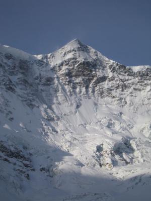 The next morning we appreciated extremely dangerous for avalanches snow-ice faults near the bottom of the wall and decided to make traverse to the bottom of our counterfort not along the slope, as pioneers had done, but along the rocks. It was noticeably harder, but safer: it was possible to organize belay there.