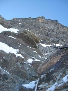 And we not vainly were afraid of the dangerous lowest part of our route: ice falling from the shoulder of Gestola broke most part of the line of our climb to the wall by powerful avalanche.