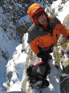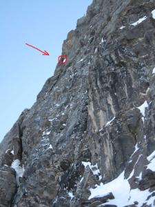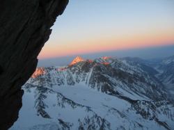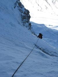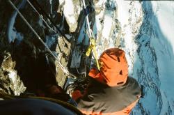 One more sitting night-pass and we came to the homestretch. That day I climbed as a leader. I tried to rise and went a little bit to the right from the top. It was impossible to come to the edge to the left from the top, and the coming was dangerous because of overhanging ice cornices. The same situation was if climbing straight forward. To the right from the top there was an unnoticeable break in the line of cornices, and I went in the direction of it.