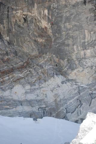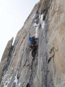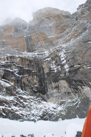 According to the information from the locals, this year precipitation was record for recent 30 years in the Lahul and Spiti regions, where Miyar valley is located. Short windows alternated with long periods of bad weather. The team spent several days under the wall waiting for the weather. During first sunny day the section till the first ledge was passed, and an opportunity to move the camp came. In subsequent days the weather was bad again or very bad. That means sun in the morning during 2- 3 hours, but in 12 AM clouds came and snowdrift began.