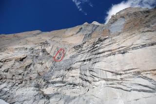 R8-R9 Go to the left and upwards along the narrow crack 7m, VI, А 3, 75°, then to the right and upwards along the narrow disappearing crack with hatchets and sky hooks, 30 m, VI, А 4, 85°.
