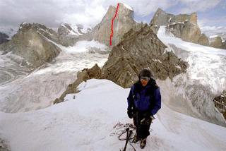 The South-Western face of Mahindra peak on the left and right sides is pressed by vertical ridges, that's why you can make photo of the wall side-view only from one of the nearest summits. We couldn't make such an ascent because of the restricted terms of our expedition. We give a photo made by Polish expedition of 2006. The South-Western face of Mahindra peak is seen on the background. Route line is marked by red coulour.