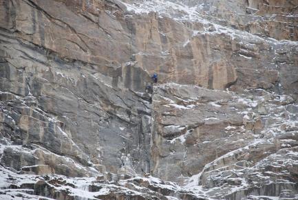 R12-R13 Go to the left and upwards along the crack 7m, VI, А 2, 95°, then go vertically upwards along the crack turning into the inner corner 25 m, VI, А 2, 85°, bypassing on the left the cornice with ice, then go upwards along the narrow crack to the beginning of the inclined snow-covered ledge, 30m, VI, А 2, 80°.