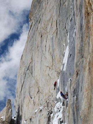 From the moment of discovery several unsuccessful tries to ascend the Mahindra peak were made. The first try which can be called successful was made by the Slovaks Dodo Kopold and Ivan Stefansky (to the North-Eastern face, route “In the last moment”) – they didn't pass only last 100-150 m. They called the mountain Mahindra. The first ascent – to the central summit- was made by the Americans Dave Sharatt and Fred Wilkinson on September 3 2007. All the tries were made along the edges of South-Western face of Mahindra peak. Before our expedition there were no tries to pass The South-Western face of Mahindra peak along its central part because of the abruptness and difficulty of this section of the face.