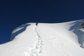 R20-R21 По острому снежному гребню вверх, через ледяной карниз-наддув, выход на вершинный купол 80м, III , 40-70°.