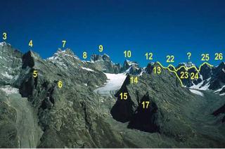 1 – Small «Shamoni» tower, 4 – summit with a «window», 7 – double summit, seen from the Base Camp, 8 – summit with a snowy plateau, 9 – Mahindra, 6080m, 10 – Grome peak (Thunder Peak), 5990m, 12 – Veneto Peak, 5850m, 14 – yellow wall (from the glacier Grom side), 15 – «big» wall near the step of glacier Grom, 16 – James Point, 17 - «small» wall near the step of glacier Grom, 19 – Paola?s Peak, 20 – peak 5700 m, 21 – peak 2725 m, 22 – Neverseen Tower, 29 –Castle Peak, 5700m.