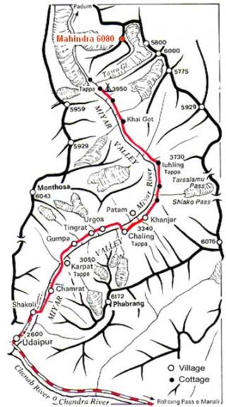 Miyar valley is located in the northern part of the Indian state Himachal-Pradesh in Lahul area, to the north from Udaypure city. Total length of the valley is almost 100 km. In the lower part of Miyar valley there are two well-known 6000: Phabrang 6172m, and Mentoza, 6443m – the highest peak of the region.
