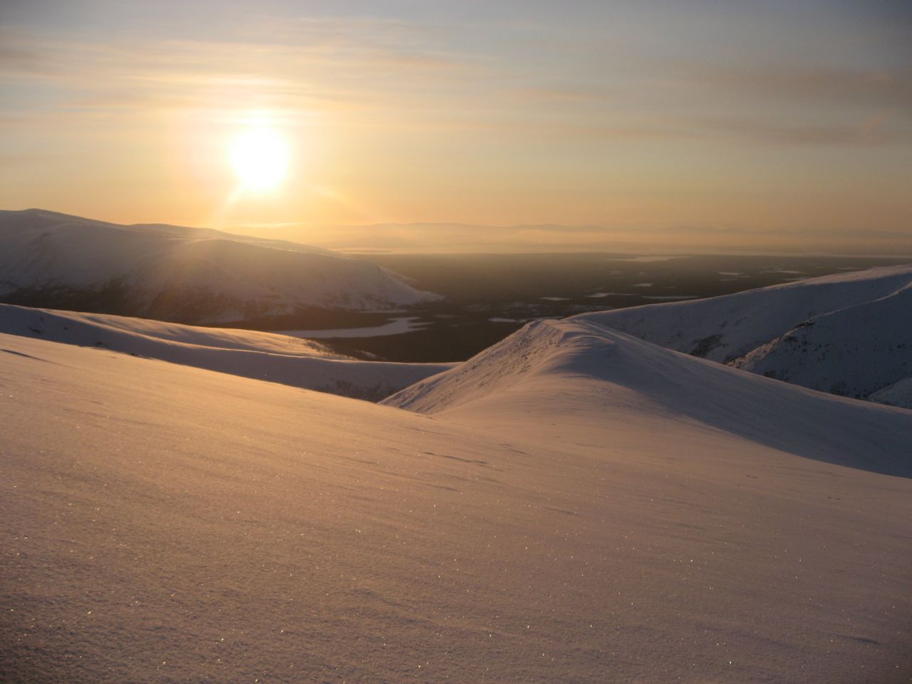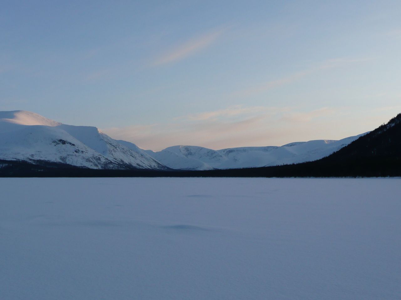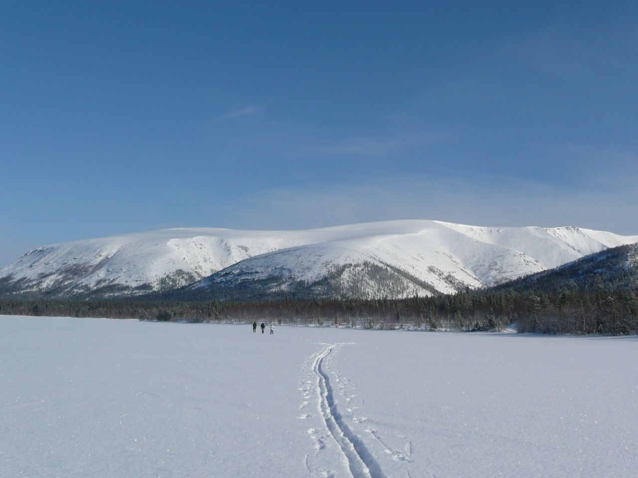 С утра отличная погода – солнце, температура -12, потом еще немного теплеет. Выходим около 9.00, выбираемся обратно на дорогу и идем по ней вниз, на север. За переход доходим до озера Гольцового (фото 15). Опытный Участник, раздухарившись, рождает предложение попробовать от перевала Северный Лявочорр дойти траверсом до перевала Северный Партамчорр или хребта над ним, т.е. превысить план по траверсной части выхода. Судя по карте и визуальному впечатлению, при хорошей погоде это выполнимо. Но для начала нам надо добраться до первого перевала.