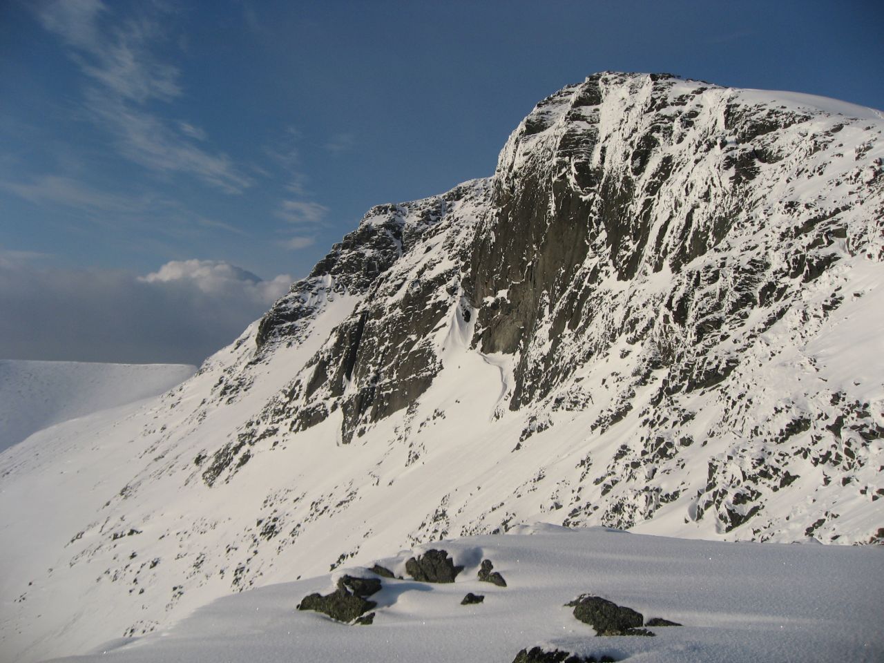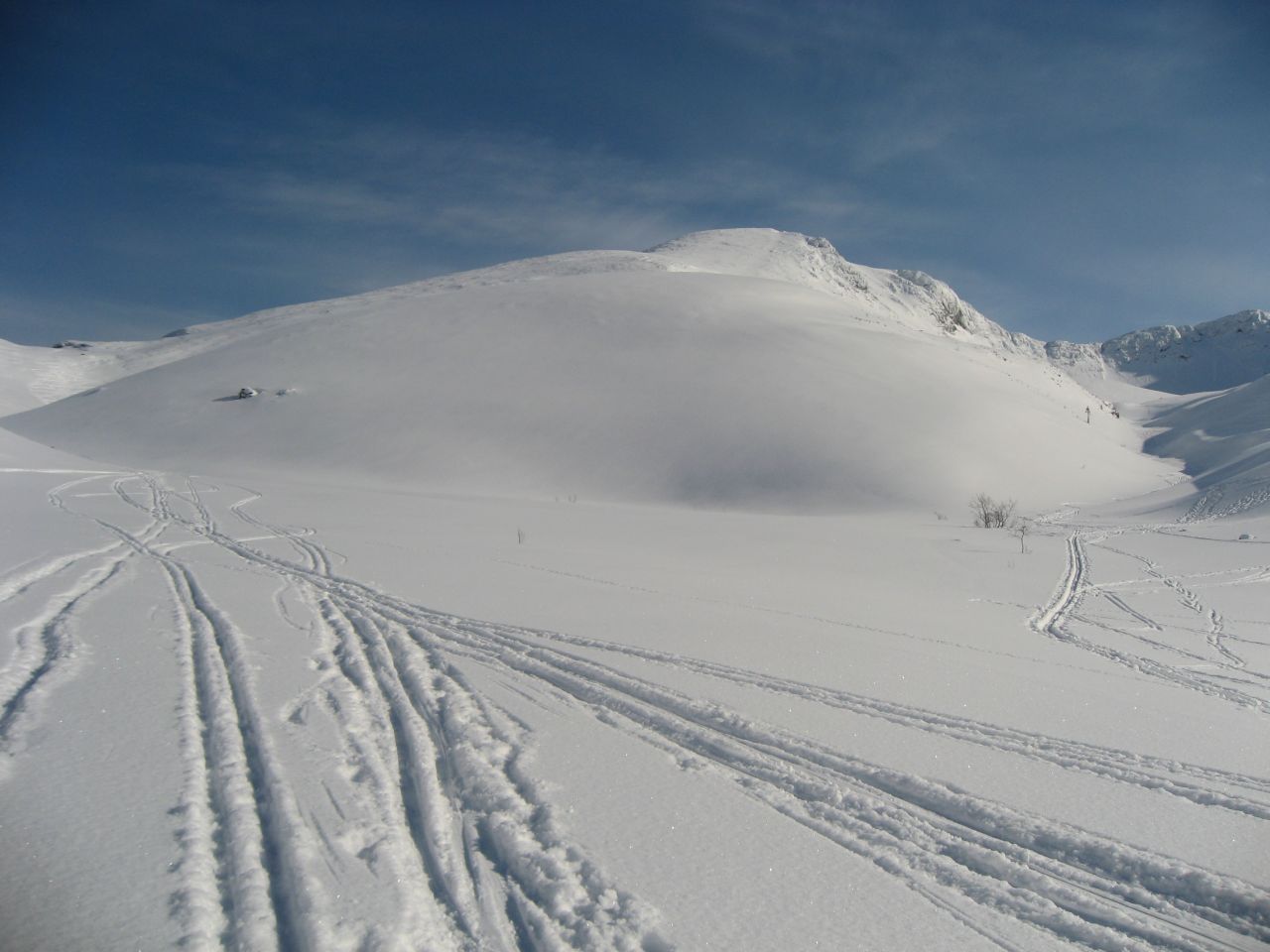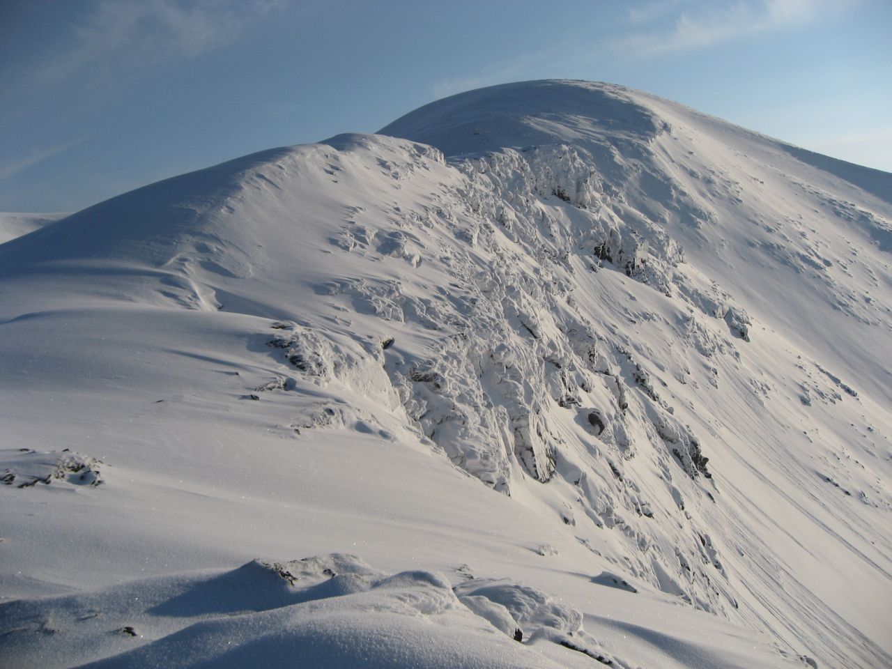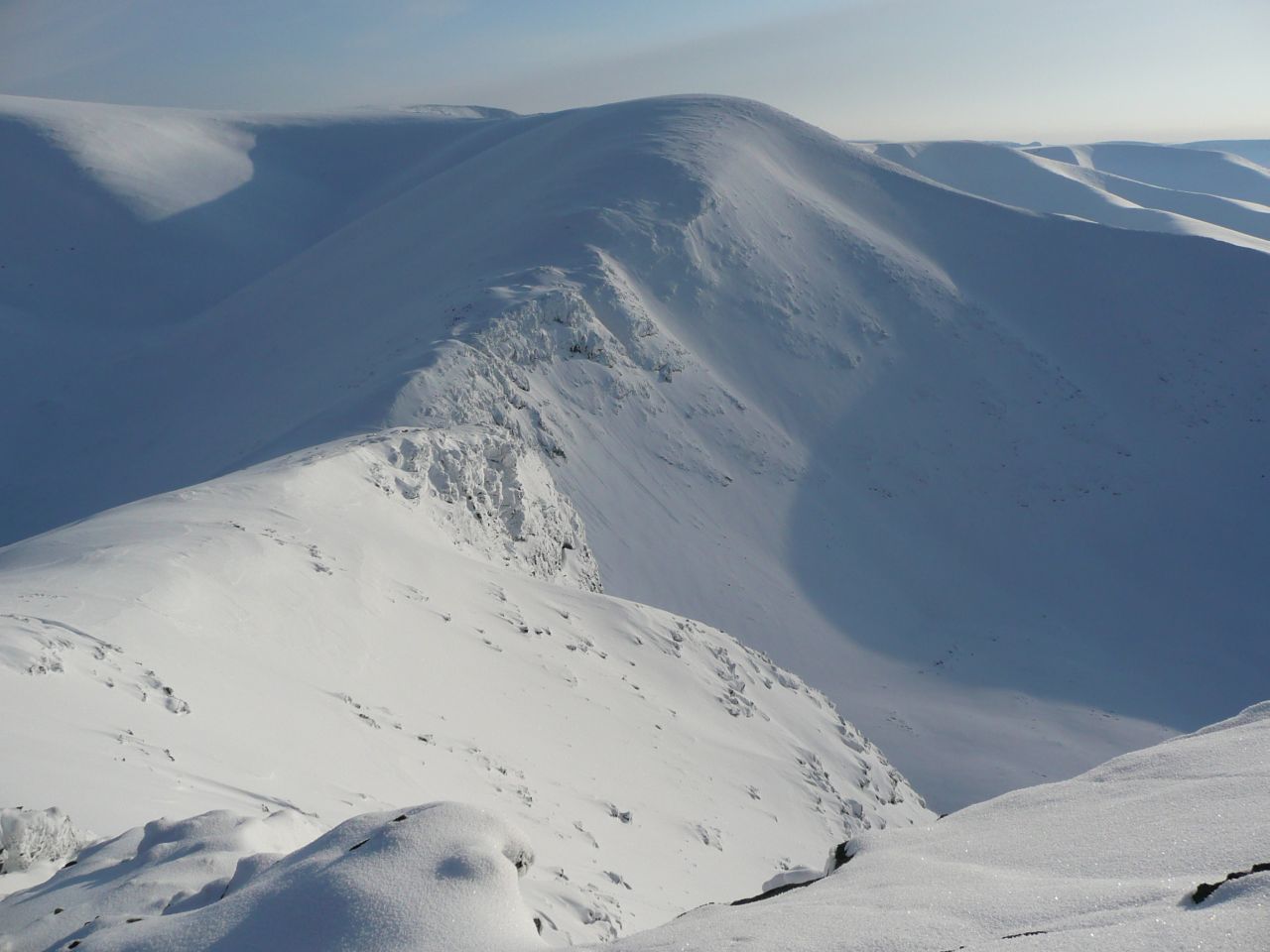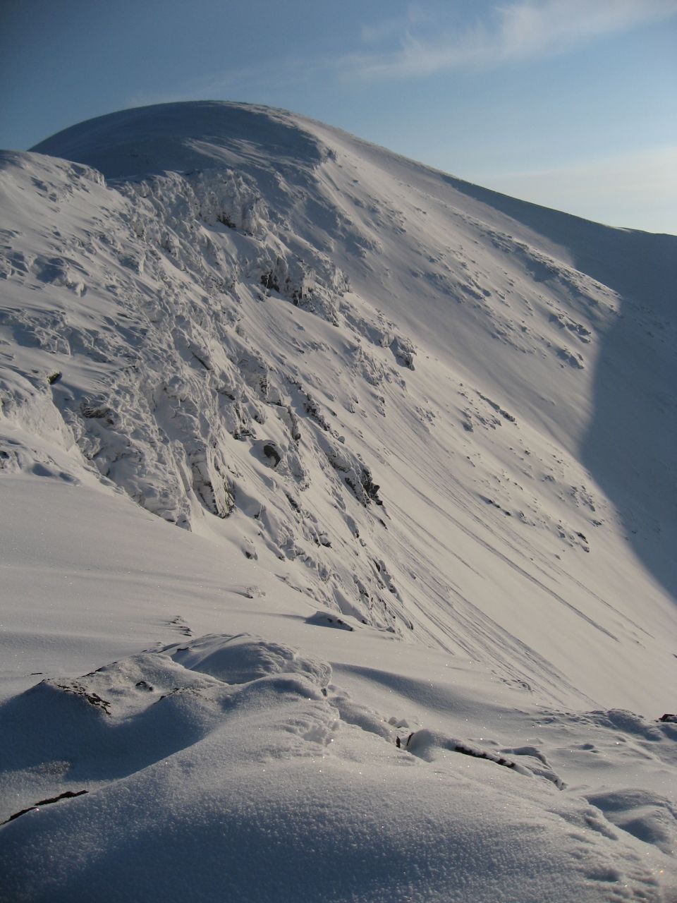 Командир и Опытный Участник прощаются с остальными и идут по гребню на Центральный Лявочорр. Вблизи оказывается, что, несмотря на изрезанность, гребень легко проходим пешком на всем протяжении. Быстро спускаемся на перевал. Его восточный склон пологий, западный имеет крутизну порядка 45 градусов (фото 26, 27). Основными проблемами с подъемом на него представляется лавинная опасность и небольшой скальный пояс наверху.