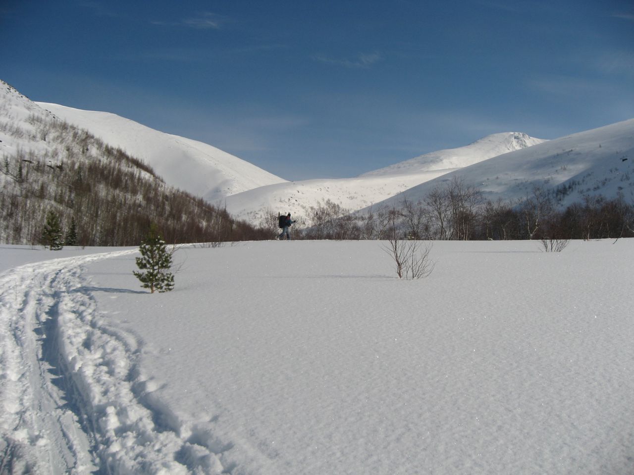 Тут старая генштабовская карта (другие топографические карты на Хибины нам неизвестны) и прошлый опыт нескольких участников, побывавших когда-то давно на этом перевале, неожиданно подводят нас. На карте никакой тропы от озера под перевал не обозначено по воспоминаниям, раньше туда пробивались из-под Партамчорра более или менее напрямую через лес, даже не выходя на озеро. Решив, что другого пути нет, мы переходим на восточный берег озера, поросший густым лесом, идем вдоль него на север и в конце концов пытаемся войти в лес по руслу какого-то маленького ручья. В лесу тропежка по колено и густой подлесок, в русле ненамного лучше, затем оно сужается до метра и начинает причудливо извиваться… Командир, тем не менее, героически ломится сквозь всю эту «сельву». Но тут Штурман, сохранивший трезвость ума и к тому же оснащенный прибором GPS с залитой картой, решает поглядеть на экранчик и с удивлением сообщает, что километром севернее в приборе показана дорога от берега озера в восточном направлении! Как раз туда нам и надо. Доверившись современным технологиям, выбираемся из коварного леса, идем вдоль берега и через километр – о счастье – видим ту самую просеку в лесу, всю в следах лыж и снегоходов.
