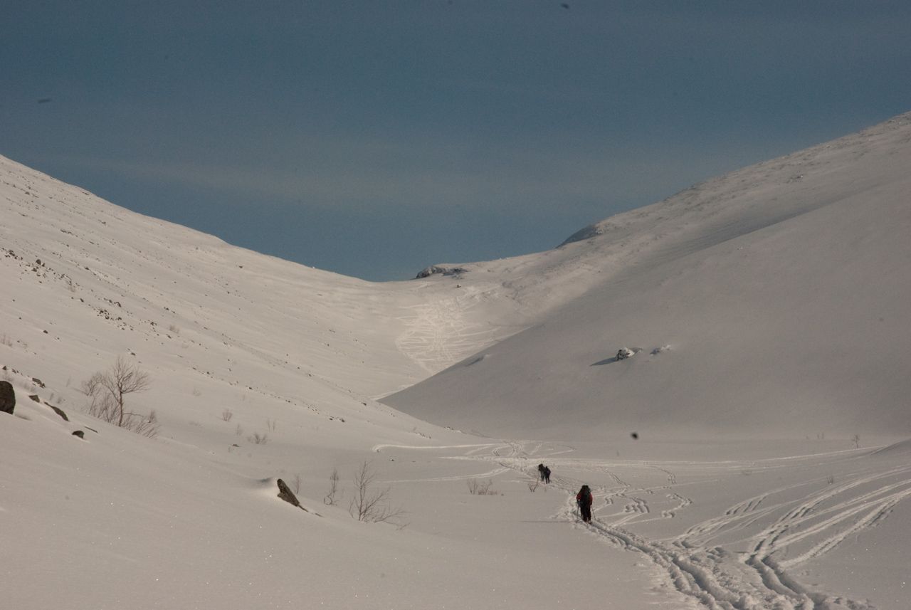 Дорога идет вдоль ручья Северный Лявойок, быстро набирая высоту. Километра через три она сужается, превращаясь в набитую лыжню. Вскоре проходим мимо двух лагерей школьных групп, а затем начинаем встречать многочисленных школьников, возвращающихся из радиалки на Северный Лявочорр. Через полтора перехода лес заканчивается (фото 16), начинает дуть несильный ветер.