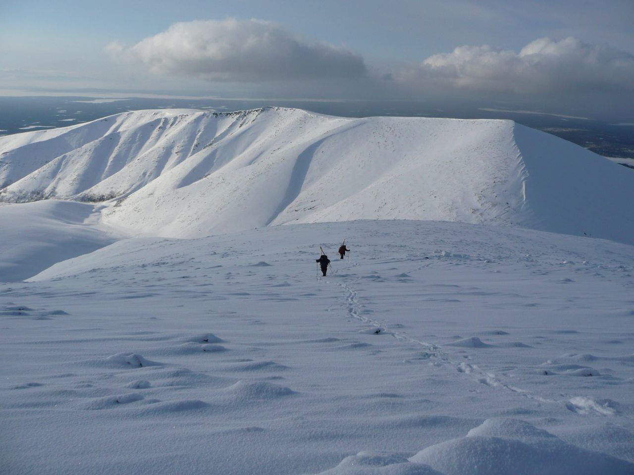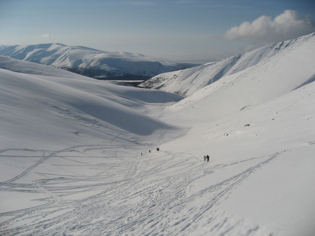Далее больше часа поднимаемся на г. Лявочорр. Подъем чисто силовой, но сил у нас уже не очень много... Вершина представляет собой еще более обширное плато, у которого и краев-то не видно (фото 28). Хребет продолжается на юг широким и плоским гребнем. Думаем, не попробовать ли пройти по нему в направлении перевалов Партамчорр, с тем, чтобы спуститься в долину ручья Лявойок (см. карту, на которой есть ручей Северный Лявойок и «просто» Лявойок. Последний течет из-под перевалов Партамчорр). На этом можно было бы сильно сэкономить расстояние, но в итоге решаем не рисковать, двигаясь под вечер по незнакомым местам и, возможно, без лыжни. Спускаемся вниз, как и планировали, по северо-восточному отрогу хребта. Вначале, из-за торчащих из-под снега камней, идем пешком. Фотографируем перевал Центральный Лявочорр и цирк под ним (фото 29). Там видна чья-то палатка – видимо, группа собирается завтра лезть на этот перевал. Дойдя до места, где склон справа делается достаточно пологим и без камней, надеваем лыжи, оставляем гребень (фото 30) и с ветерком скатываемся по склонам в северном направлении, обратно в долину ручья Северный Лявойок.