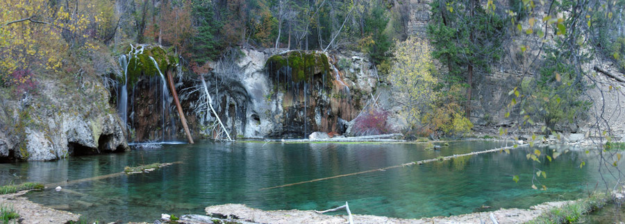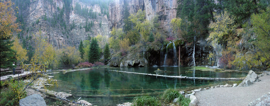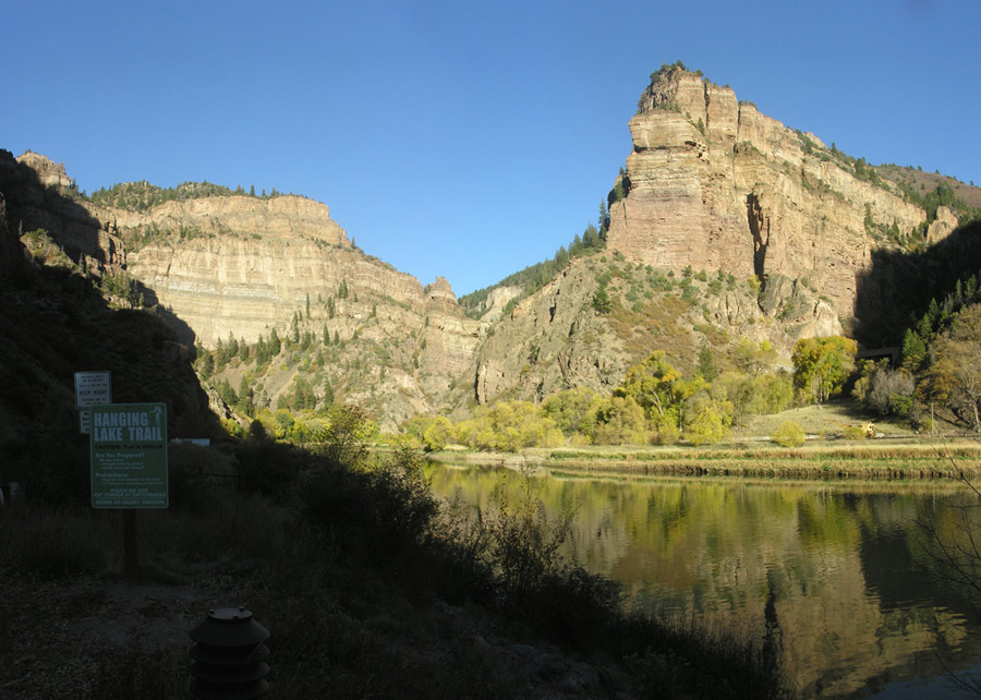 Вдоль дороги есть где остановиться, чтобы не только осмотреться, но и пройтись по предусмотренным – порой длинным – тропам. Спрессованные временем, мы ограничились только одной, но длительной прогулкой – к Висячему озеру (Hanging Lake). Это небольшое озерцо в нише среди вершинных скал питается водопадиком и ручьем стекает вниз к реке. До него метров 500-600 набора высоты, а это не менее часа темпового подъема и полчаса спуска по каменистой тропе, плюс время у озера. Мы хотели поспеть к озеру, застав солнце, но поднялись уже с началом сумерек – и не пожалели: дыхание и краски вечера чарующе усилили мрачновато-отрешенную готику сумеречной скально-озерной картины.