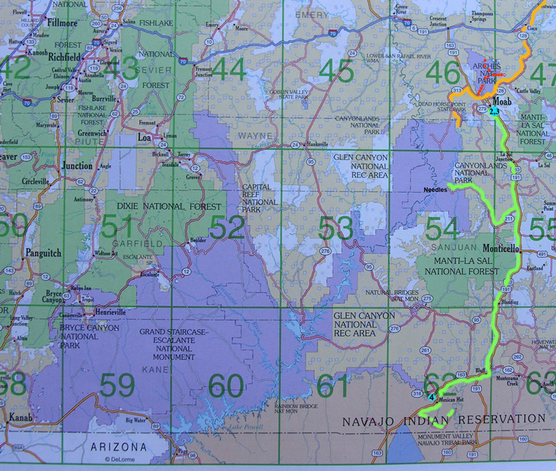 День 1-й: переезд через Скалистые горы из Денвера в городок Грэнд Джанкшн (Grand Junction), пеший подъем в горах к Висячему озеру (Hanging Lake). День 2-й: посещение нац. парка Colorado National Monument, переезд в Юту в городок Моэб (Moab), проводы солнца на севере парка Canyonlands. День 3-й: весь день в нац. парке Арки (Arches), неподалеку от городка Моэб. День 4-й: продвижение на юг, к Аризоне, попутный заезд на смотровую площадку Иглы (Needles) в восточной стороне Canyonlands, вечерняя автопрогулка по нац. парку Долина памятников (Monument Valley) в районе резервации племени Навахо (самая дальняя точка маршрута). День 5-й: обратный путь – другой дорогой – в Колорадо, вечернее катание по нац. парку Mesa Verde, с экскурсией по скальным поселениям индейцев. День 6-й: продвижение на север по живописной горной трассе San Juan Skyway Loop до городка Урэй (Ouray). День 7-й: дальнейшее продвижение на север, автопрогулка по парку Черный каньон (Black Canyon of the Gunnison), вечернее возвращение в Денвер. В этой 1-й части публикации представлены маршруты и посещения первых двух дней автопробега.День 1-й.
