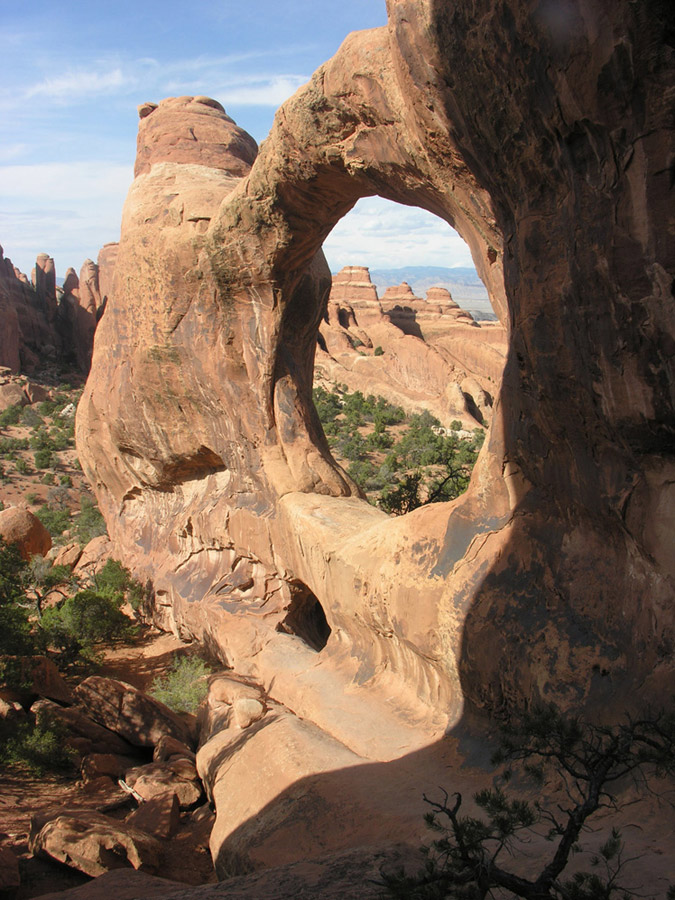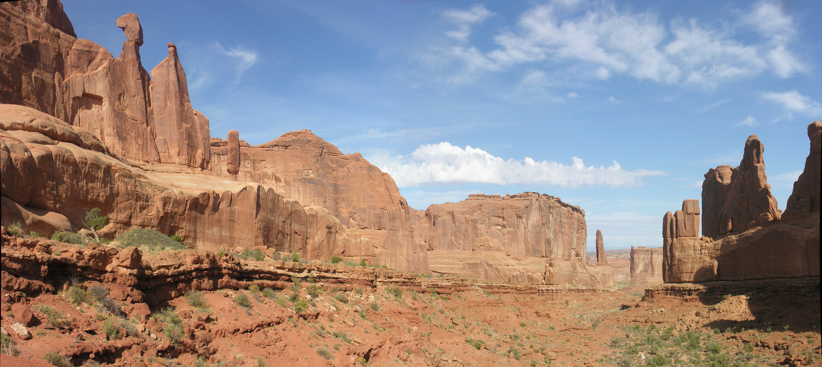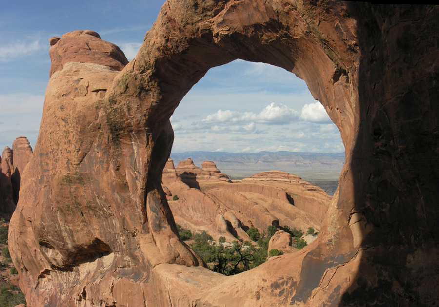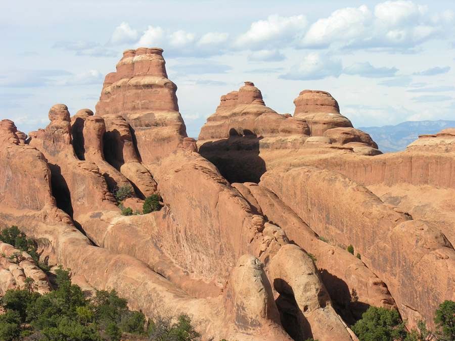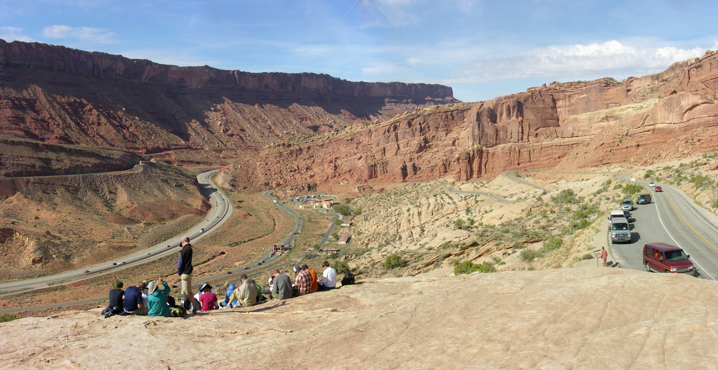 Наш «день Арок» начался в городке Моэб (Moab), где мы провели ночь (и проведем следующую). Всем необходимым – суточным питьем, едой и бензином – запаслись на старте: на территории парка ничего этого не будет. Съезд к парку – в 6 милях к северу по дороге US-191. От съезда – затяжной подъем по образцовой петляющей дороге, то и дело предлагающей остановиться и совершить короткие пешие маршруты среди бастионов паркового скального авангарда.