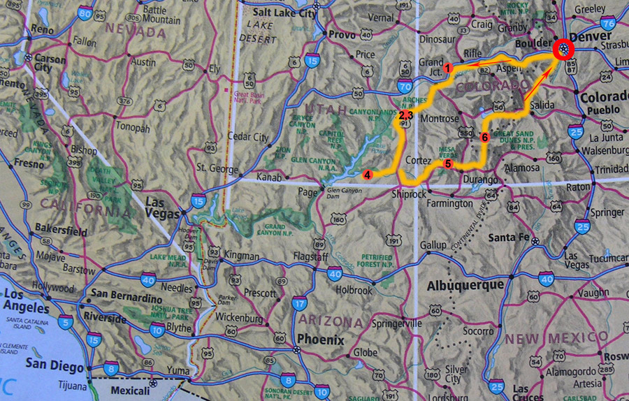 Карта маршрутных посещений 2-4 дней, штат Юта. Оранжевая линия – 2-й день, красные кружки – 3-й, зеленоватая линия – 4-й. Цифры в голубых кружках – номера ночевок на маршруте