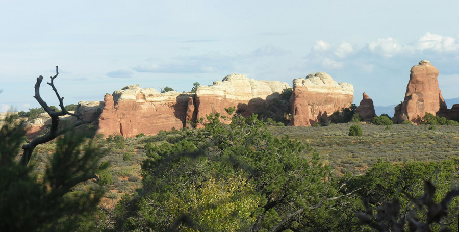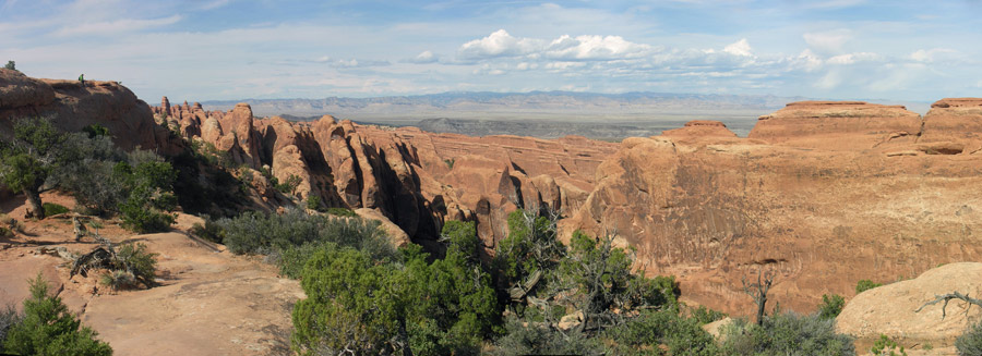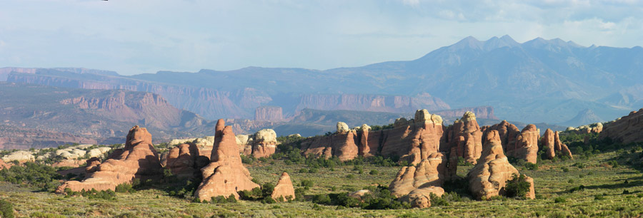 На обратном пути по пешему маршруту. Вдали вершины массива La Sal. Правее них – нагорный бассейн реки Колорадо и наша вчерашняя площадка Dead Horse Point