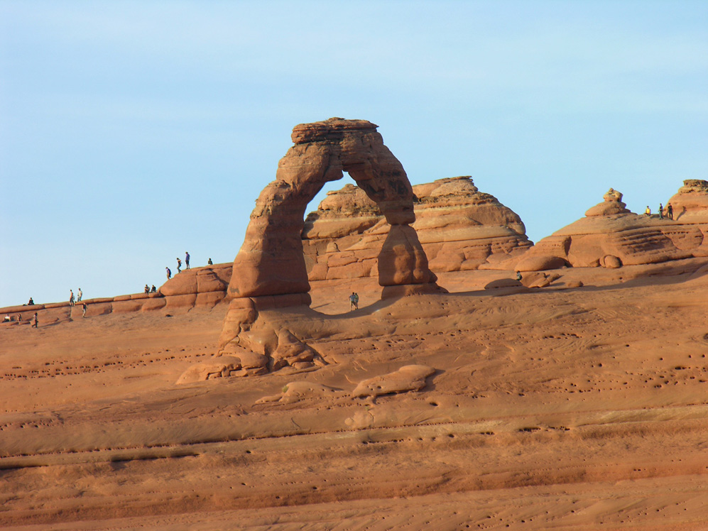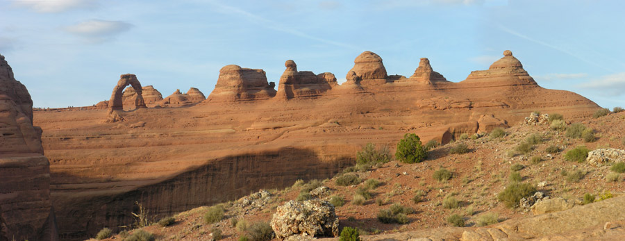 На обратном пути по парковому плато, уже вечером, мы свернули к стоящей далеко в стороне Изящной арке (Delicate Arсh). Боясь опоздать к закату, выбрали вариант с подъездом к ближней стоянке, от нее сто метров пешего подъема к дальним видам на Изящную арку. Солнце действительно уже садилось, когда мы вышли на виды. При наличии времени, конечно, стоило подъехать ближе к Арке по другой, объездной дороге.