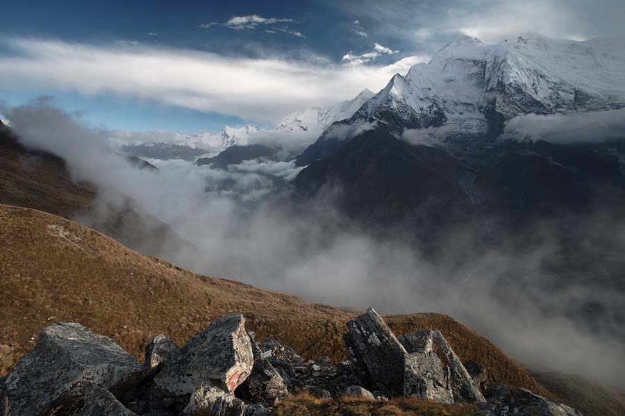 В левой части кадра над долиной реки Марсианди возвышаются Аннапурна III 7555 м., и Гангапурна 7455 м. А вдалеке, в центре кадра виднеется пик Тиличо 7134 м.
