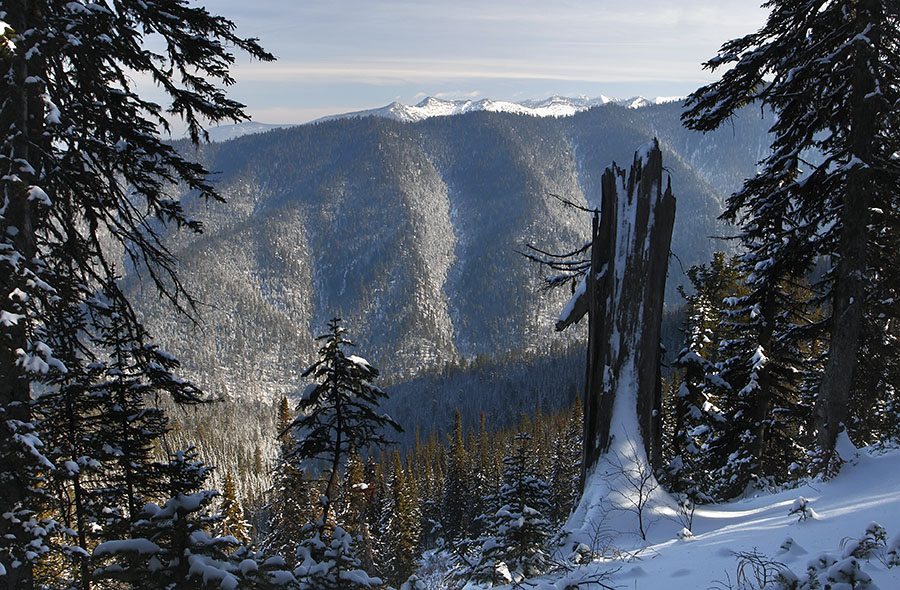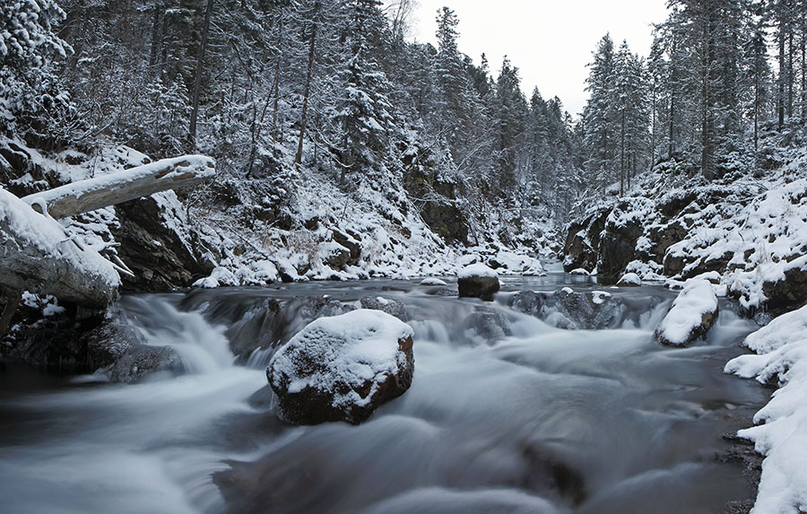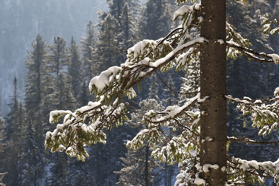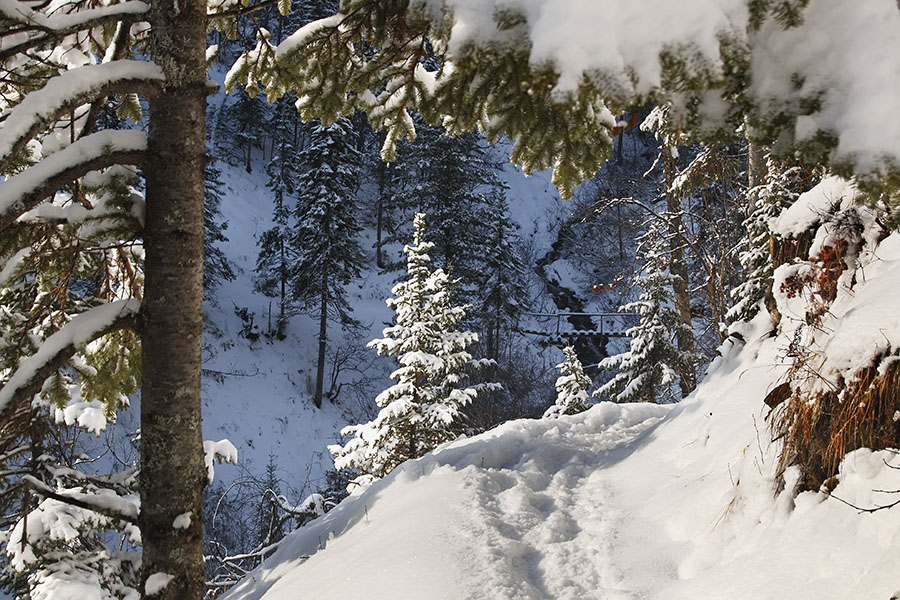 Готовлю обед и отправляюсь гулять вдоль реки, и далее по тропе. К полудню тучи расползаются, солнечные лучи прорываются в ущелье и снег нестерпимо блестит и сверкает, слепя глаза. Чем ярче светятся солнечные склоны, тем отчётливей насыщаются синевой лишённые света. Возвращаюсь уже в сумерках. Дальние предметы теряют свои очертания и растворяются. Вода, тягучая как кисель, уже не шумит, а приглушённо шепчется, ворчит и переговаривается, не скоро ещё она поддастся сковывающей силе мороза, и раз от раза будет намораживать зеркальной чистоты, полупрозрачные зеленоватые наледи.