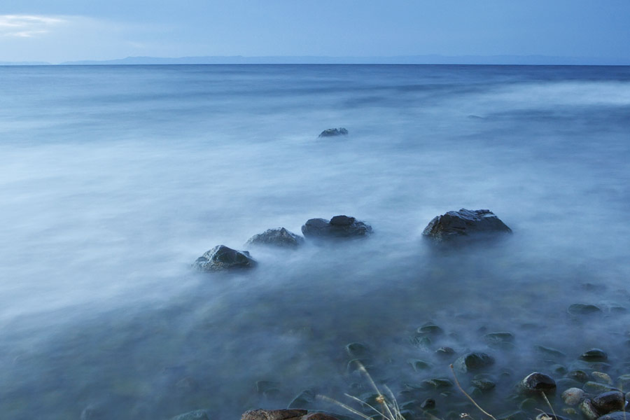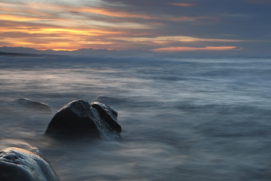 Синим контуром Приморского хребта с угадывающейся брешью истока Ангары маячит вдали противоположный берег. Сливаясь с озером к северу, растворяется в туманной дымке. Садящееся солнце, то прячась за облаками, то вновь выныривая из их пелены, постепенно расцвечивает картину.