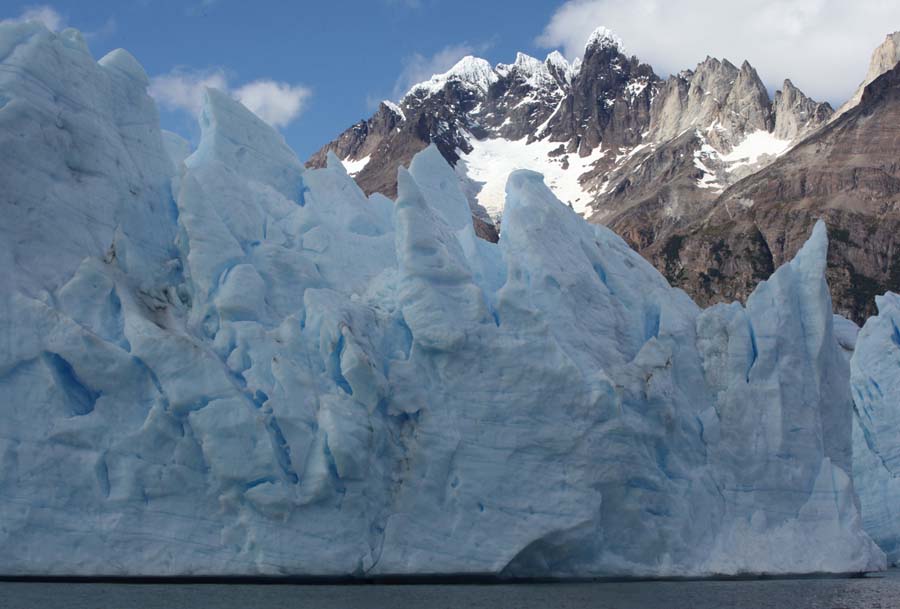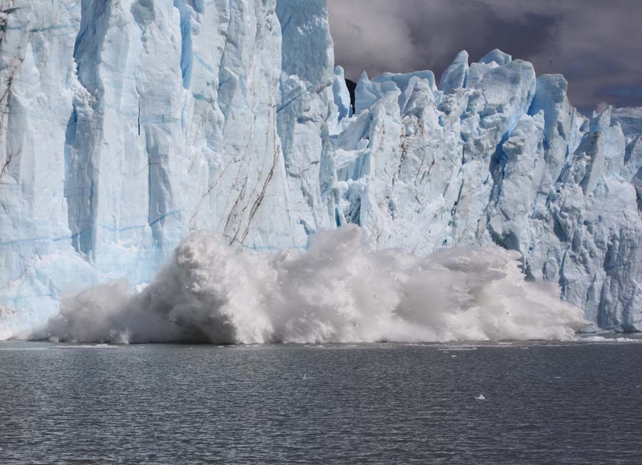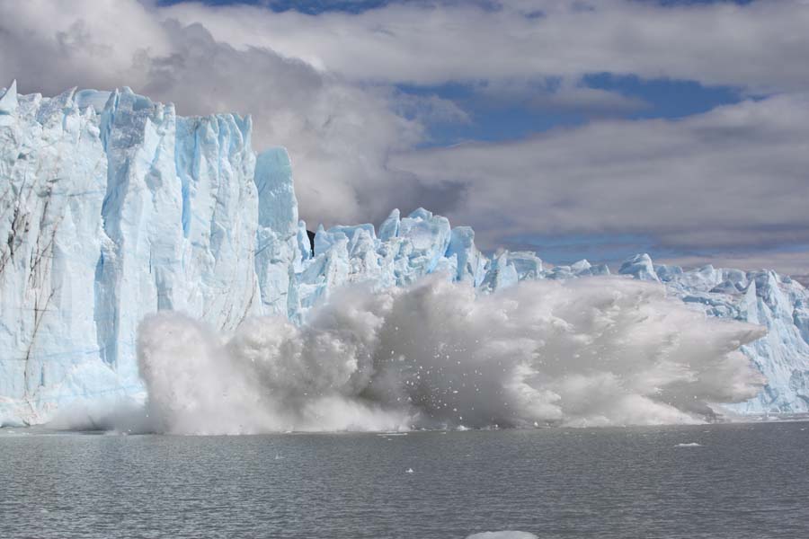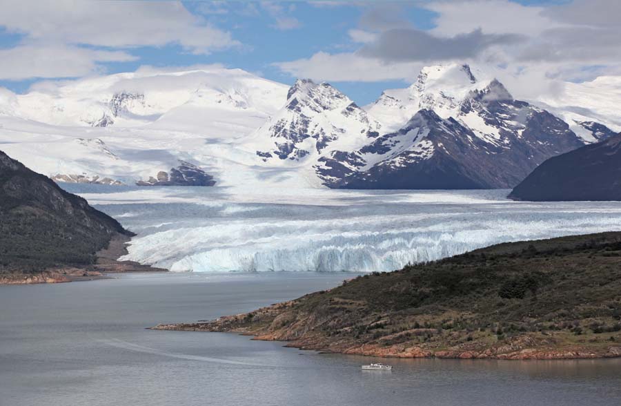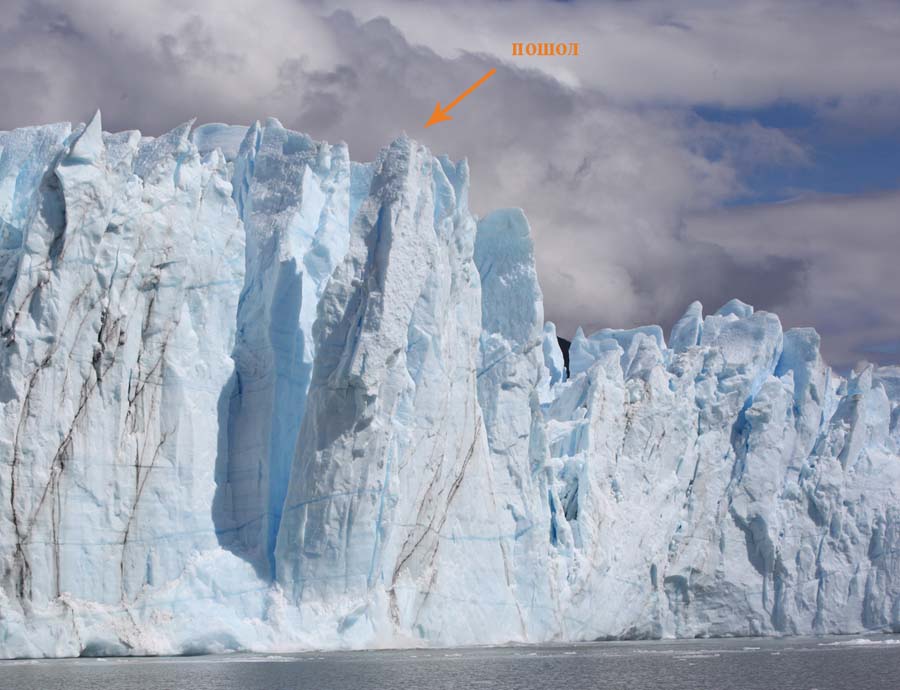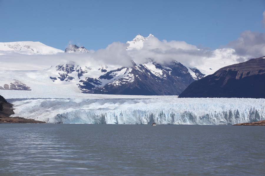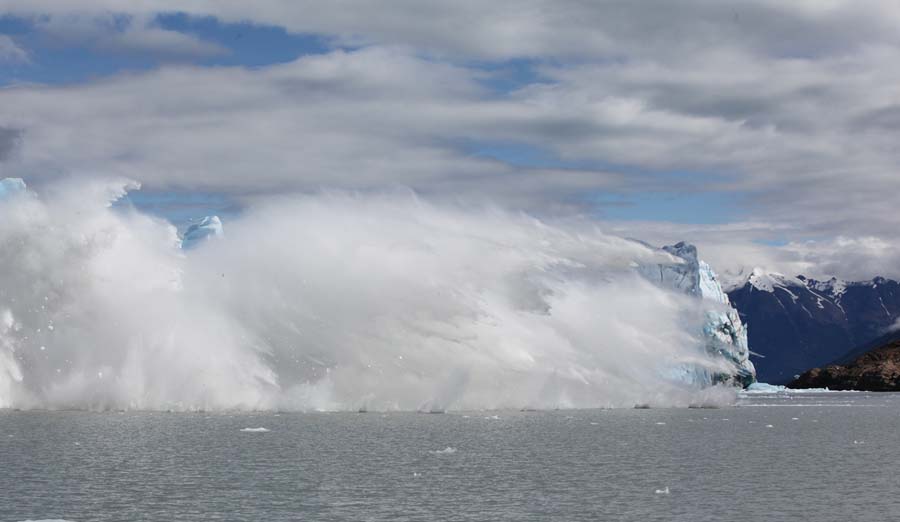 Perito Moreno – наиболее мощный и внушительный среди ледников парка, в его устье плотные ряды ледяных зубьев взмывают вверх на 40 метров! (На 2-м и 3-м снимках видно, как сильно разнятся по высоте двухэтажное судно и ледниковая стена.) К передней стене ледника ходит экскурсионный кораблик. Но ближе чем на 100-150 метров он не подходит, потому что время от времени, примерно раз в полчаса, происходит крушение и обвал какого-нибудь исполинского 40-метрового ледяного зуба. Это событие великого местного масштаба. Картина эпическая. Нет ни страха, ни ужаса, ни драматизма – есть восторг и восхищение.