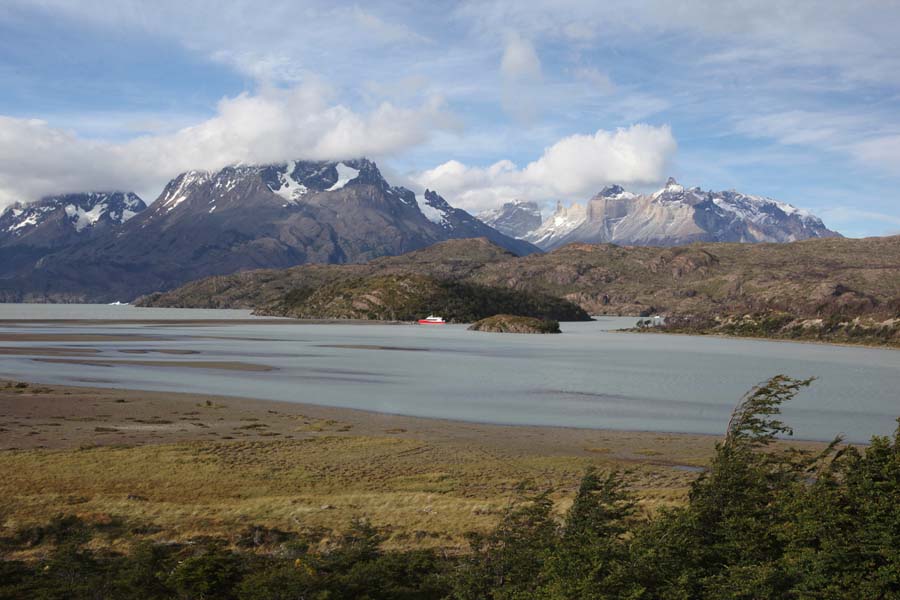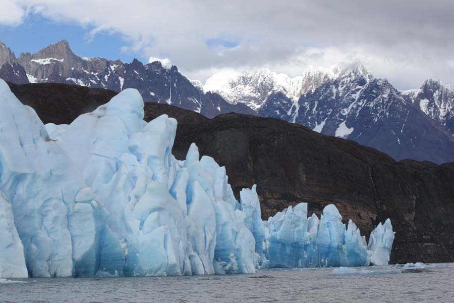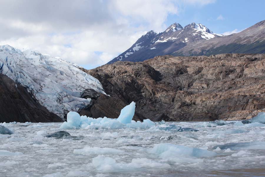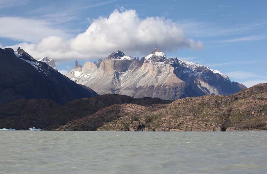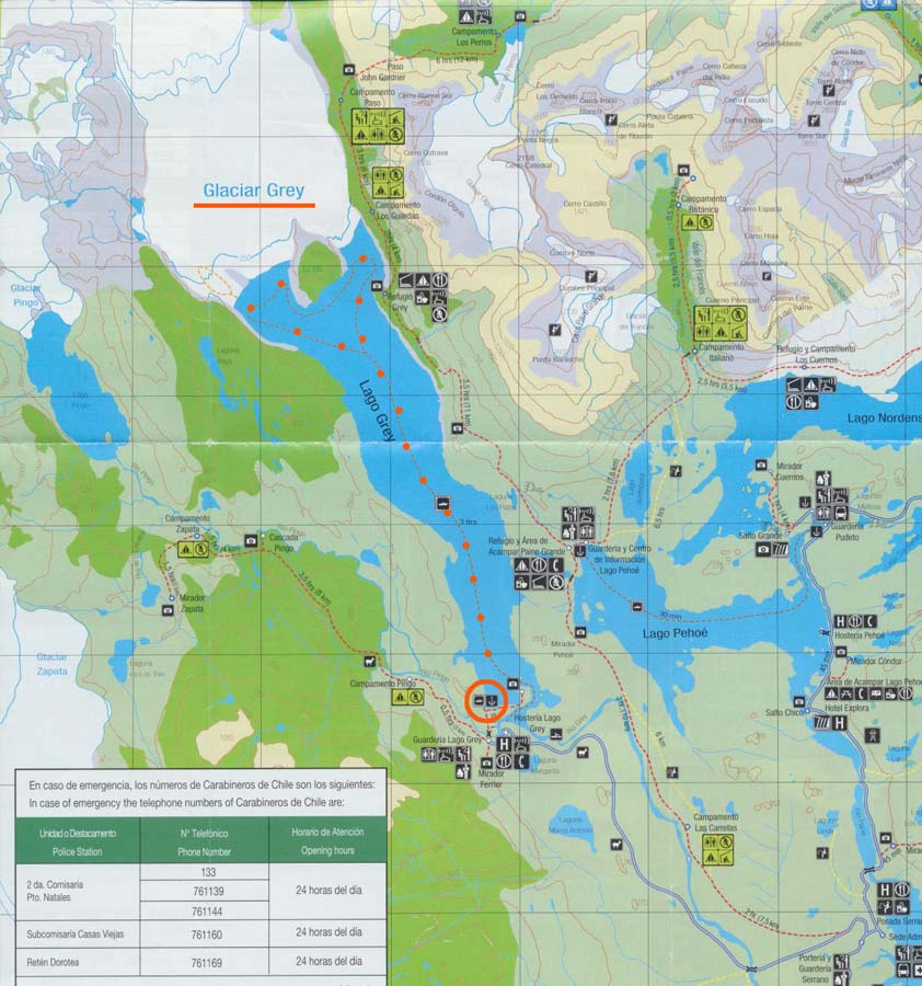 Первая картинка в этом фото-блоке – карта фрагмента парка Torres del Paine с отмеченным на ней маршрутом прогулочного кораблика по озеру Lago Grey к одноименному леднику. Остальные – озерно-горно-ледниковые виды с воды.