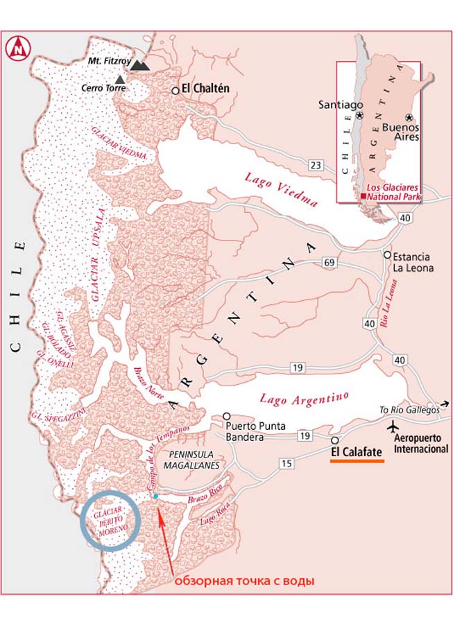 Первая картинка в этом фото-блоке – схема парка Los Glaciares с отмеченным на ней положением ледника Perito Moreno и указанием места его наблюдения. Остальные снимки – раскадровка крушения ледникового исполина.
