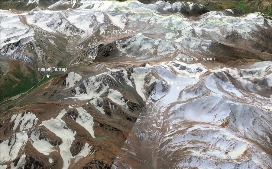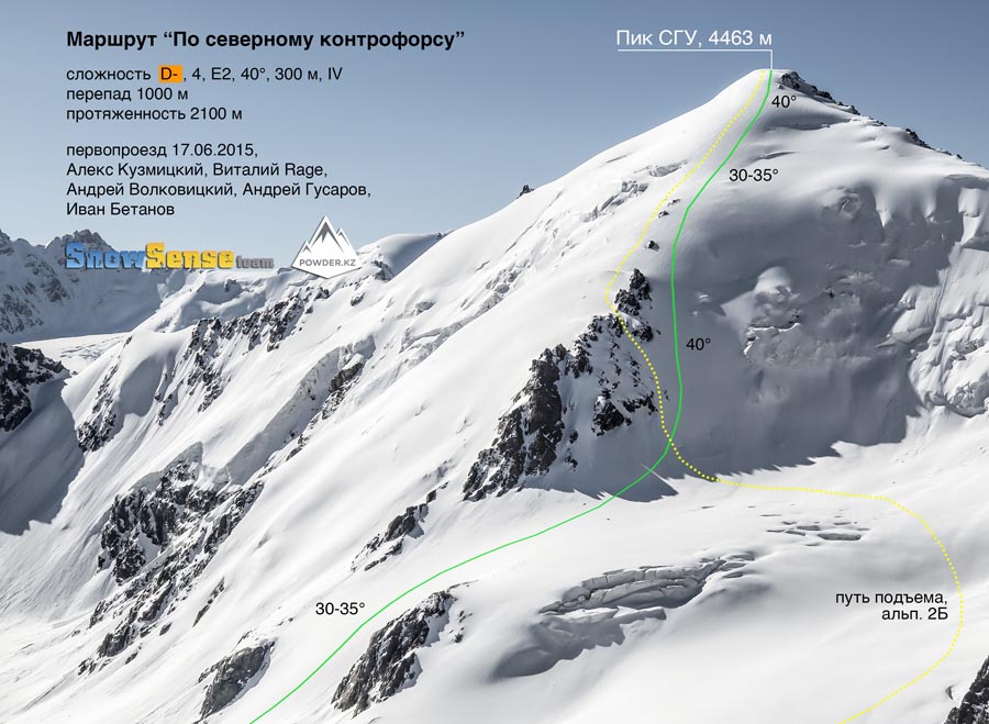 Присоединился к команде Snow Sense, чтобы сделать совместный первопроезд с пика СГУ 4429м. (высота по данным со спутника) расположенного за перевалом Туюк-су в верховьях Левого Талгара. Красивейшая вершина. Последняя попытка съехать была предпринята BC Team в 2005г. Тогда в августе парни проехали 2/3 маршрута. С тех пор, как прочитал об их приключениях на форуме, идея спуска меня не отпускала.