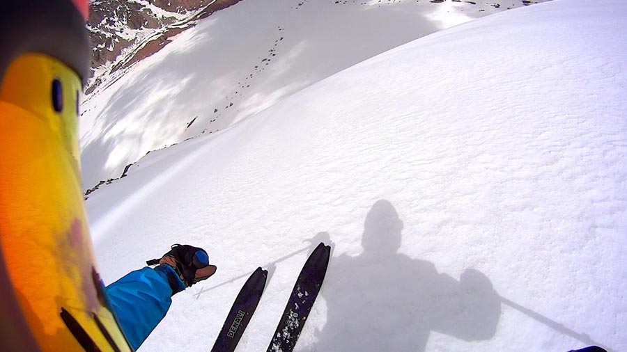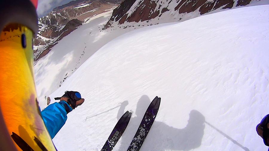 Как же я ошибся! Я ожидал мягкого снега, а получил лед. После двух поворотов по стене с 20-ти килограммовым рюкзаком, я понял, что если упаду, то полечу до самого выката метров 500 ниже по курсу без малейшего шанса задержаться. Но останавливаться и жать не было желания и я погнал на контроле вниз, ведь, все-таки, это полезно для опыта. Внизу на леднике уже отпустило и было веселее.