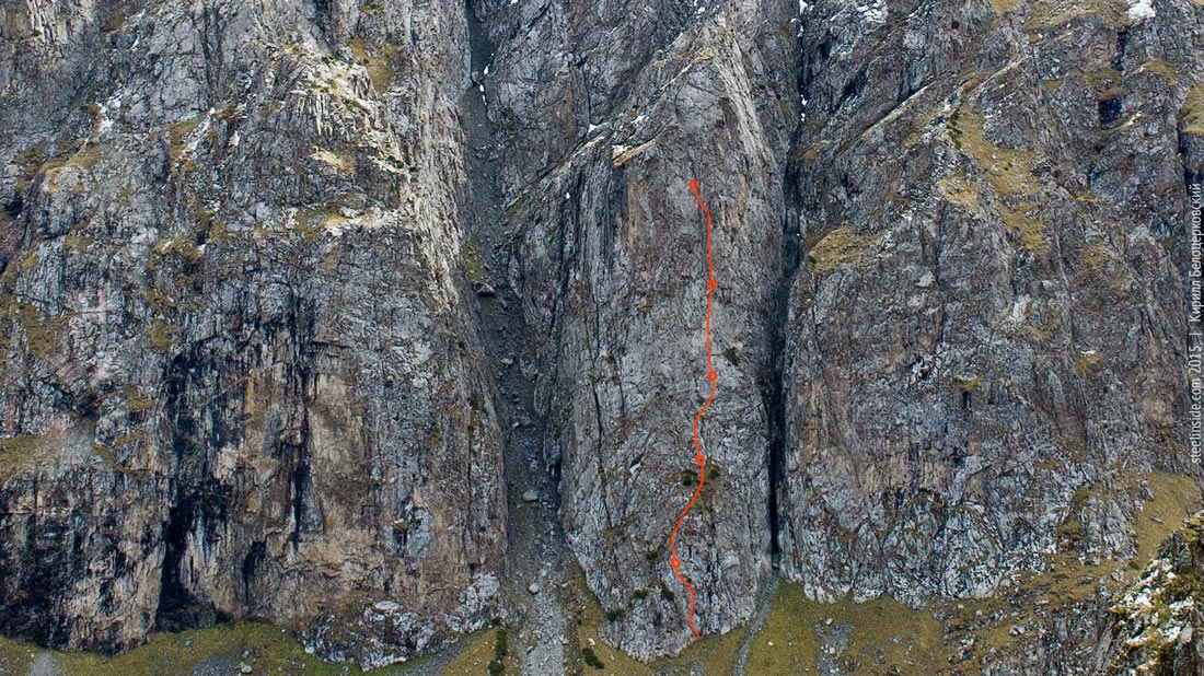 Маршрут начинается в нижней части контрфорса, чуть левее середины. Для пробивки автор маршрута — Юрий Горбунов — использовал строительные анкера. Юра пробивал маршрут сверху и вообще рассчитывал его на альпинистов. Отсюда несколько минусов: длина участков около 50 метров, станции в неудобных местах и сильно разбросанные точки страховки (приходится лезть с двумя верёвками).