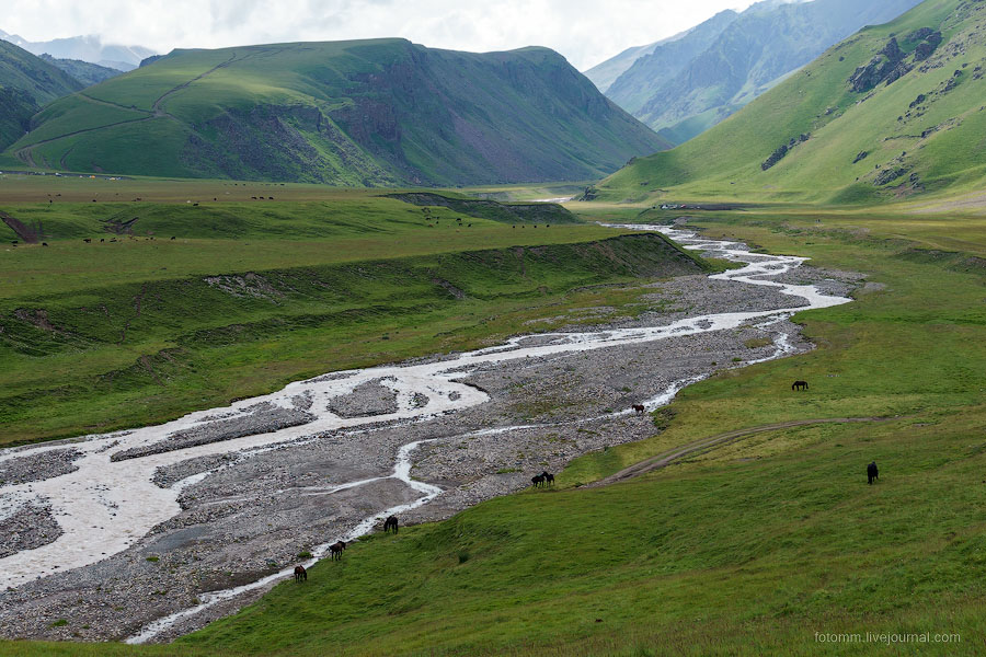 Решили прогуляться по тропе выше. В получасе ходьбы от источника находится поляна Эммануэля. Отсюда генерал Эммануэль с местными проводниками впервые поднялся на Эльбрус в 1829 году. Сейчас тут пасутся коровы и лошади, стоит кошара и через ручей альплагерь.