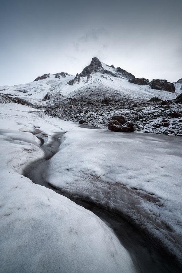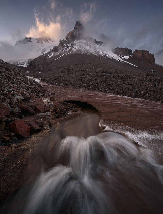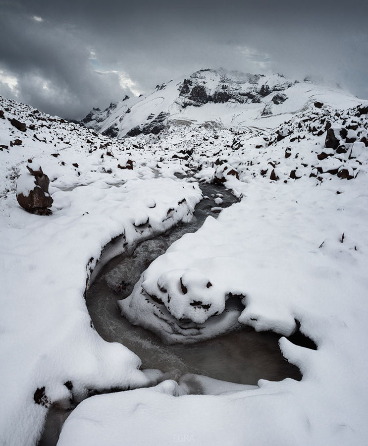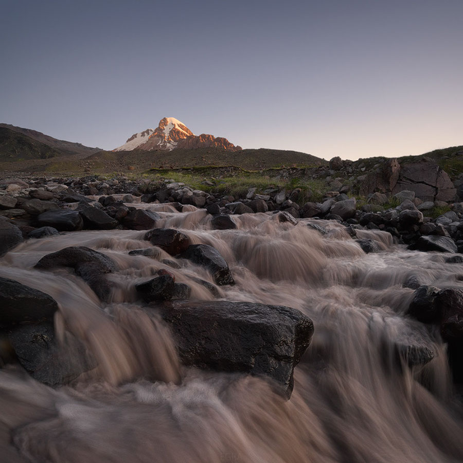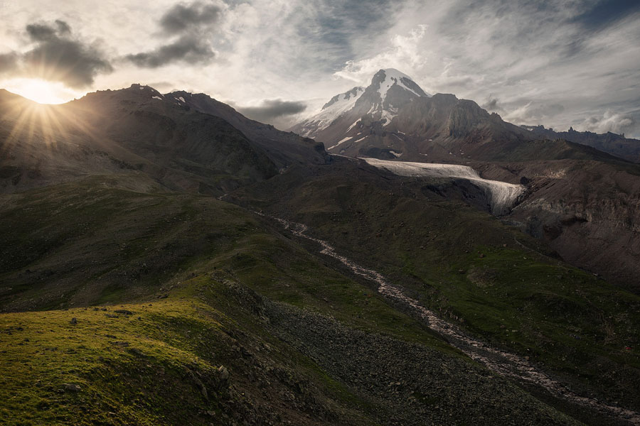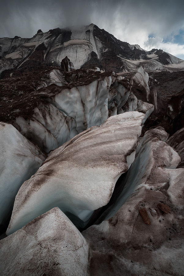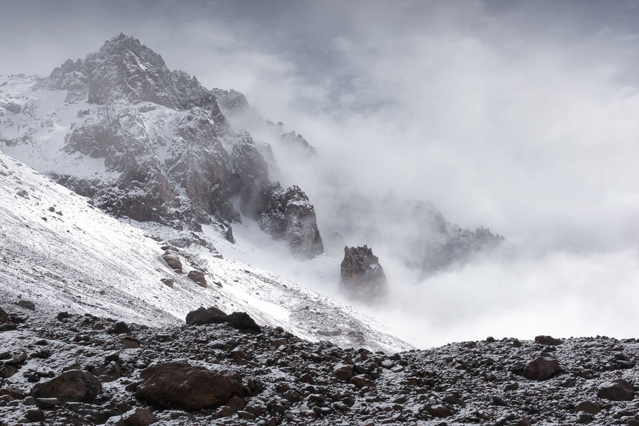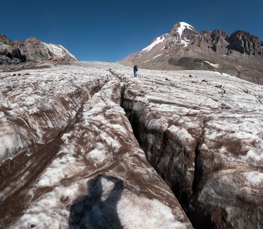 Сначала мокрый снег съедал остатки наших сил, а после плато - он же удвоил эффект перемежаясь с грязью. И только здесь, под непрестанно рушащимися стенами Казбека, возвращаясь с его вершины в полном измождении, для меня наглядно сложилась вся цельная картина происходящих процессов жизнедеятельности Земли. Хорошо видно как снег и лед, являясь неотъемлемой и составной частью горы, формируют её при осадках и холоде и разрушают оную на солнце и жаре. Только увидев столь близко, как и откуда возникает вода, которая устремляется на сотни километров, пока не прибежит к океану, понимаешь то, что и так знал, но теперь уже не из учебников, а совсем на ином уровне - непосредственно.