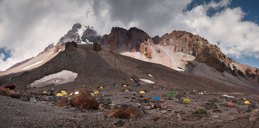 Поблизости - водопровод, туалет, гора мусора, палатки, навьюченные кони. Эти животные здесь главный элемент превосходства, а также преимущество и бизнес. Они выполняют функции носильщиков, поднимают и тех, кому не идется самому. Но выше метеостанции лошадиный навоз уже не встречается. Буквально на 200 метров вверх (не по тропе, а по вертикали) есть две стоянки для штурмовых лагерей: у белого и черного крестов. Мы встали на первой. Высота около 3850.